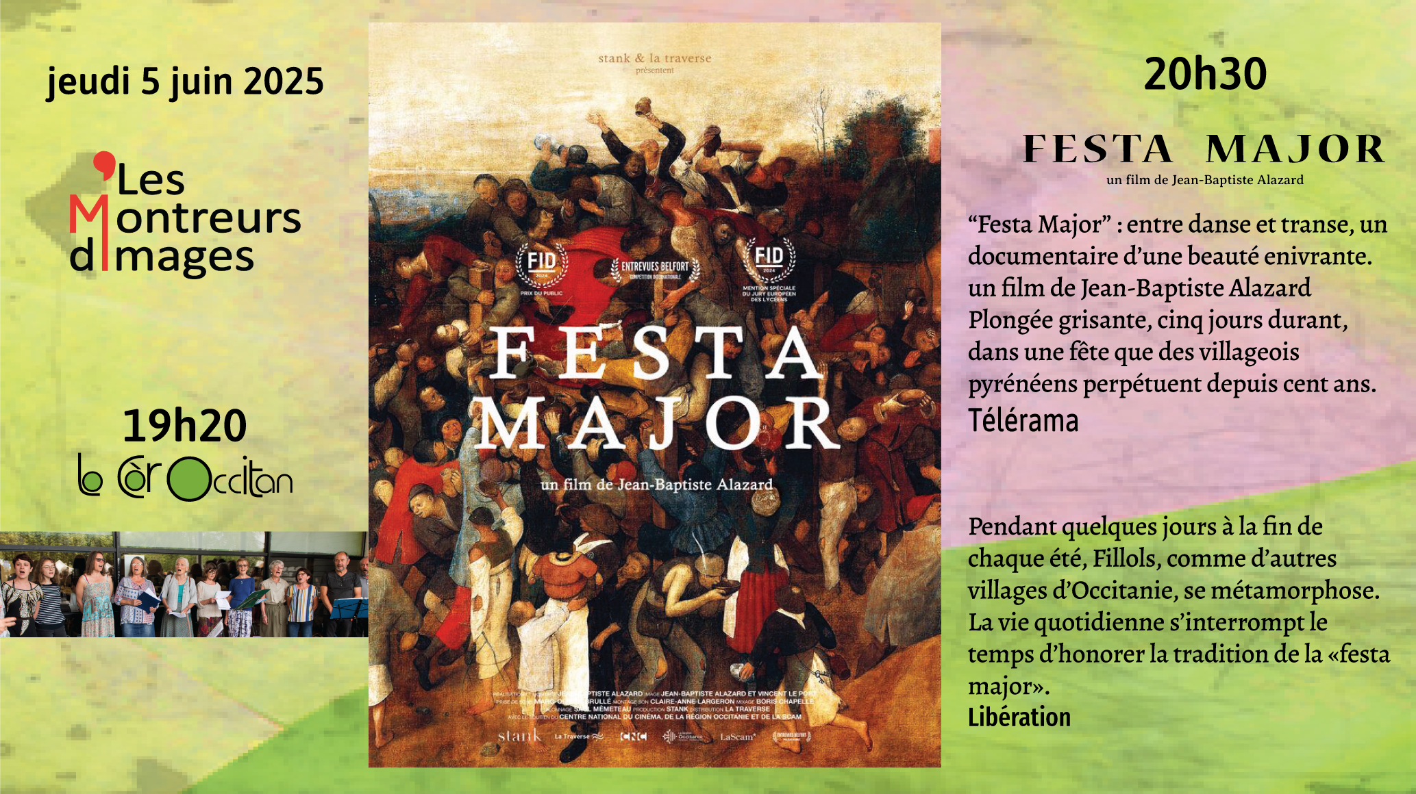 « Festa major » : entre danse et transe, un documentaire d’une beauté enivrante. Plongée grisante, cinq jours durant, dans une fête que des villageois pyrénéens perpétuent depuis 100 ans. Pendant quelques jours, à la fin de chaque été, Fillols, comme d’autres villages d’Occitanie, se métamorphose. La vie quotidienne s’interrompt le temps d’honorer la tradition de la « Festa Major ».