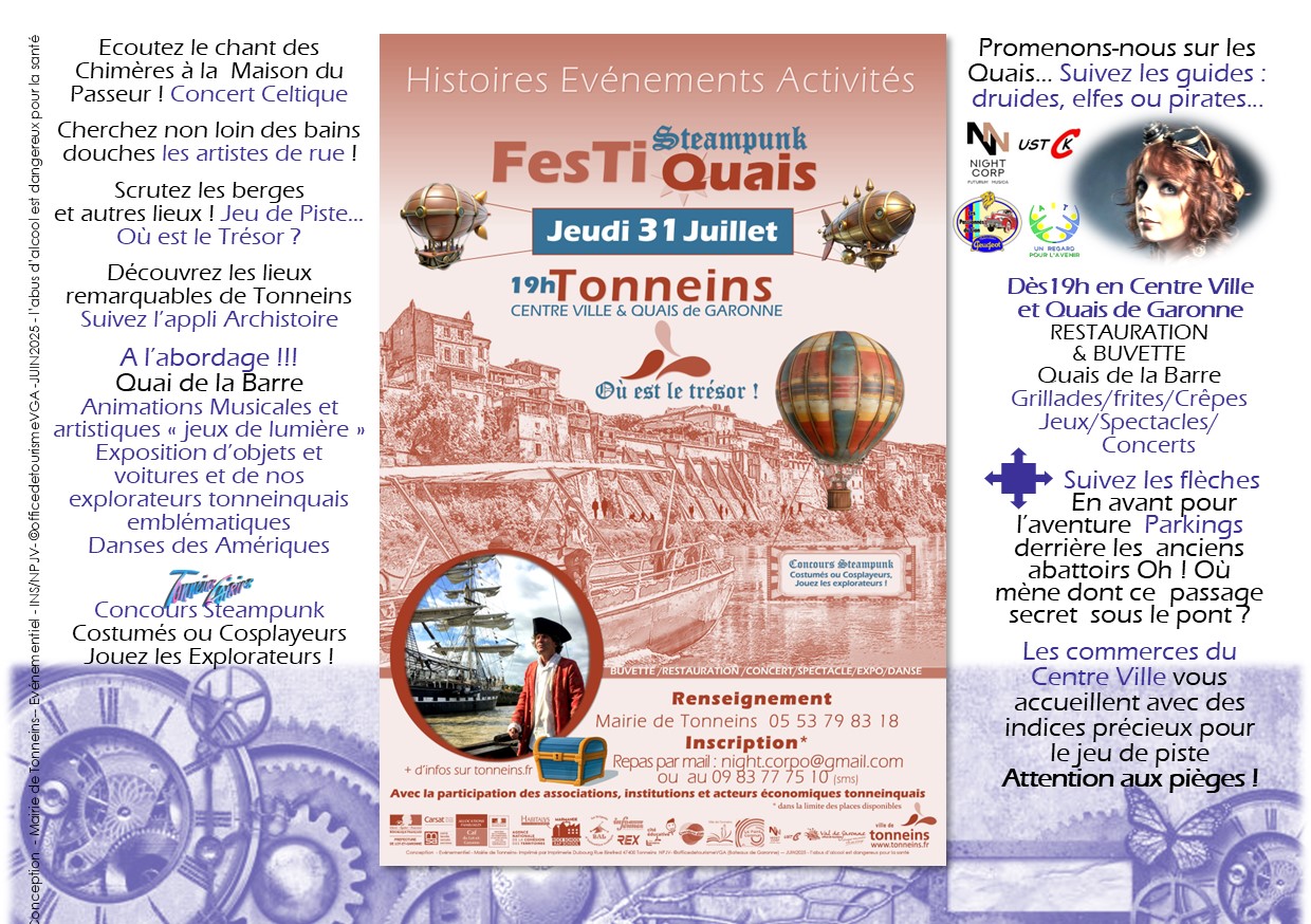 Dans le cadre des animations de « Festi’Quais », la ville de Tonneins prévoit une soirée avec de nombreuses animations sur les quais de Tonneins avec au programme, dés 19h :
