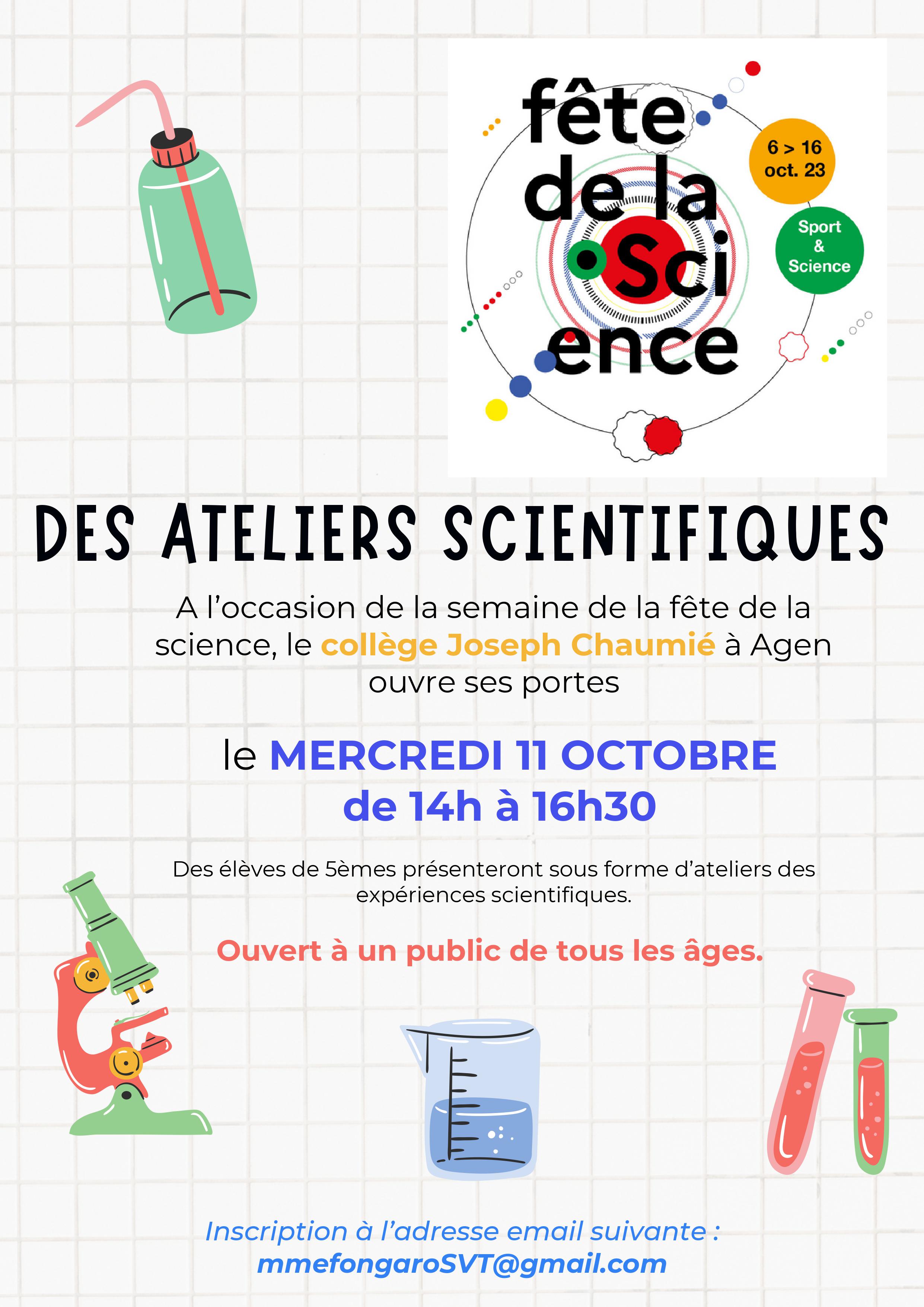 A l’occasion de la Fête de la Science, Le Collège Chaumié est ouvert et une dizaine d’élèves motivés de 5ème réaliseront des expériences scientifiques ouvertes au public.