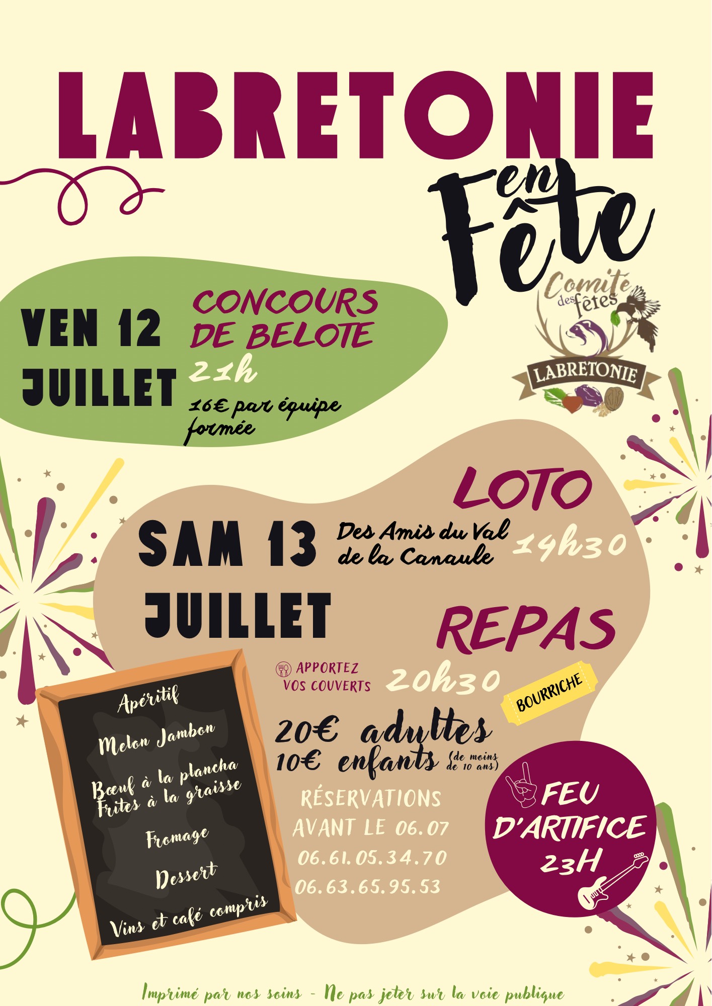 La fête votive de Labretonie propose deux journées d’animations pour tous : Concours de belote, loto, repas et feu d’artifice.