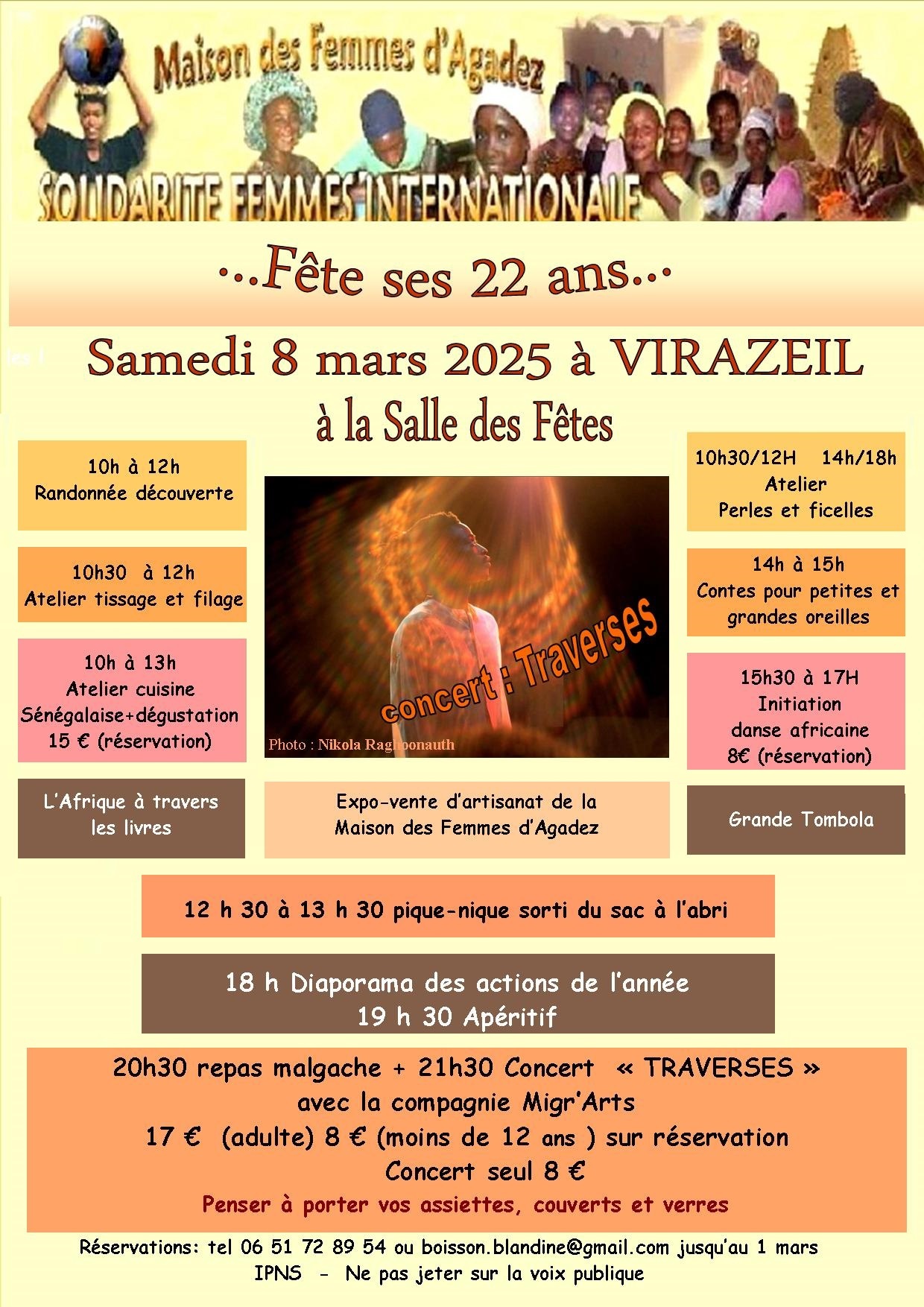 Vous pourrez connaitre les actions réalisées par notre association à Agadez au Niger et admirer l’artisanat traditionnel du Niger sur un stand d’expo-vente puis vous régaler d’un délicieux repas malgache suivi du concert « Traverses » par la compagnie Migr’Arts.