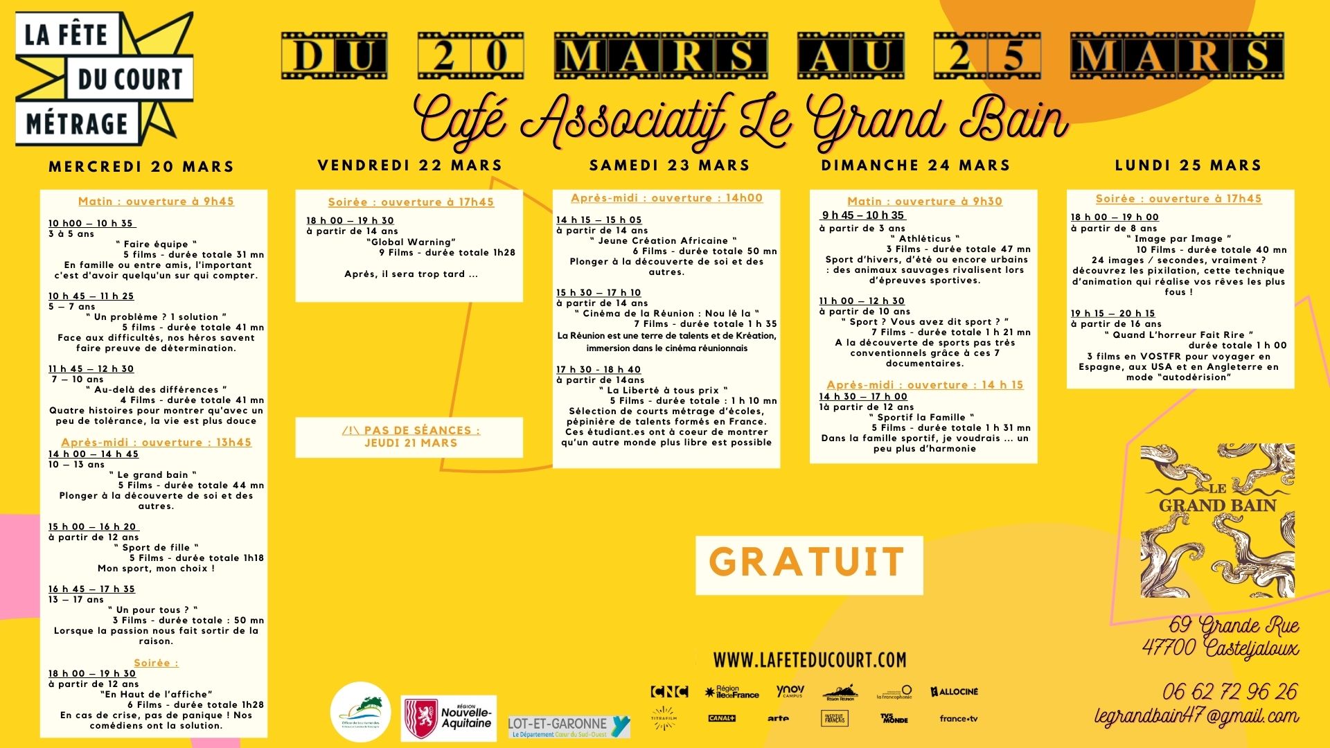 Au Café Associatif Le Grand Bain : quel est le déroulement de la semaine de la Fête du Court Métrage ?16 séances sont organisées, vous pouvez voir le détail sur l’image mise en avant présentant pour chaque séance de projection :les horairesl’âge du public concernéle nombre de court de la séancela durée totale de la séance.