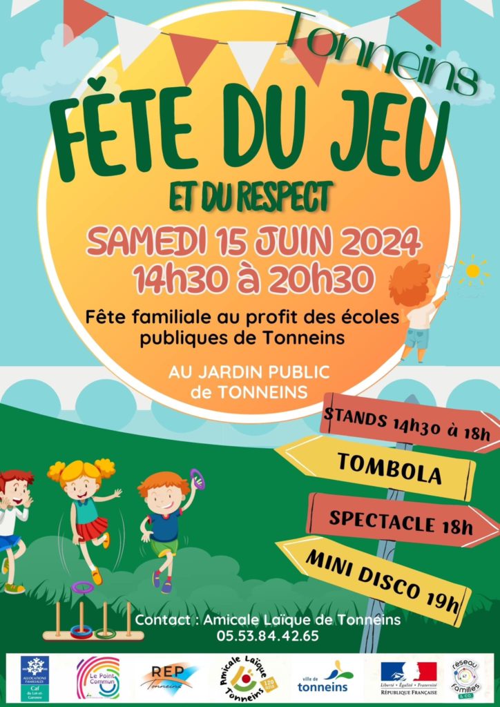 L’Amicale Laïque de Tonneins organise la fête du jeu et du respect au jardin public de Tonneins le samedi 15 juin de 14h30 à 20h30. Cette fête populaire, financée par la CAF, se veut être un moment festif au profit des enfants, de leurs familles dans l’état d’esprit de jadis la fête de l’école.