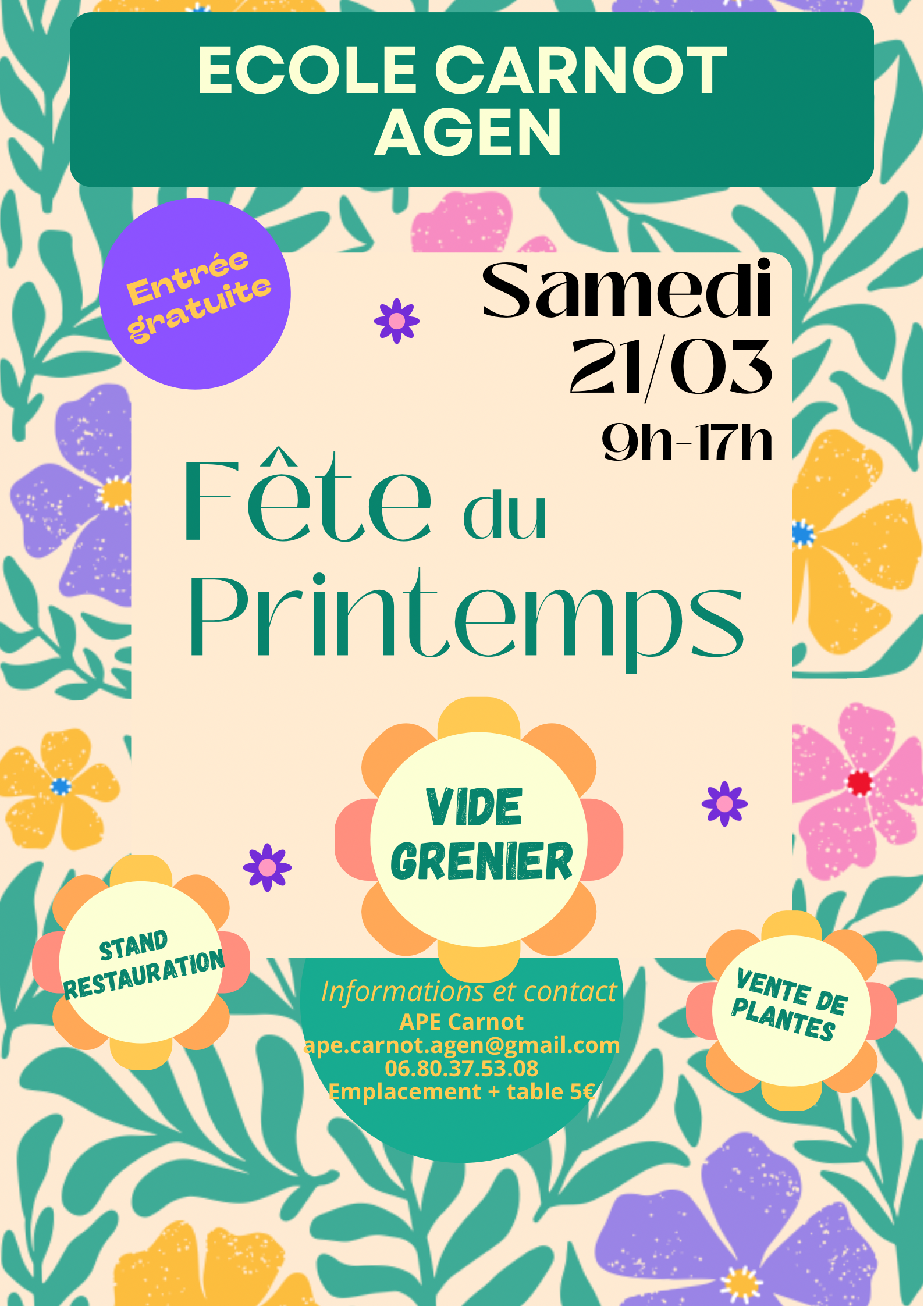 L’association des Parents d’Elèves de l’école Carnot d’Agen vous invite à sa Fête du Printemps le samedi 21 mars.