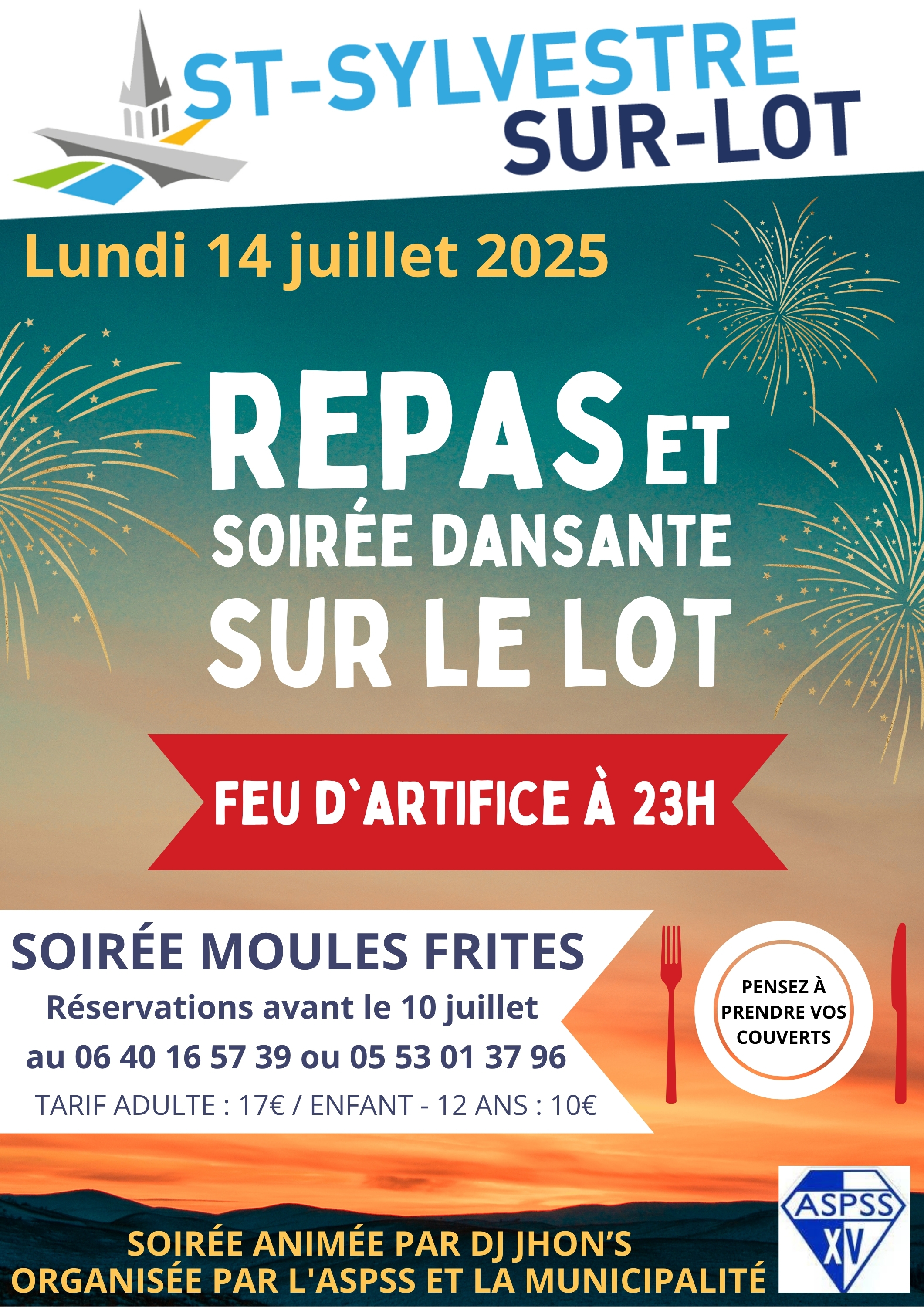 Lundi 14 juillet, place du Marché, l’ASPSS de Rugby à XV et la municipalité vous convient à la célébration de la Fête Nationale : repas convivial suivi d’une soirée dansante animée par DJ Jhon’s, puis feu d’artifice.
