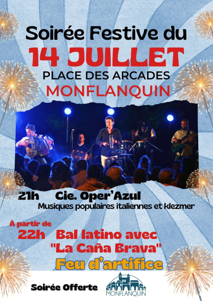 A partir de 21h : Concert d’Opér’Azul (Musiques populaires italiennes et klezmer) et de Caña Brava (Latino, cumbia, merengue).