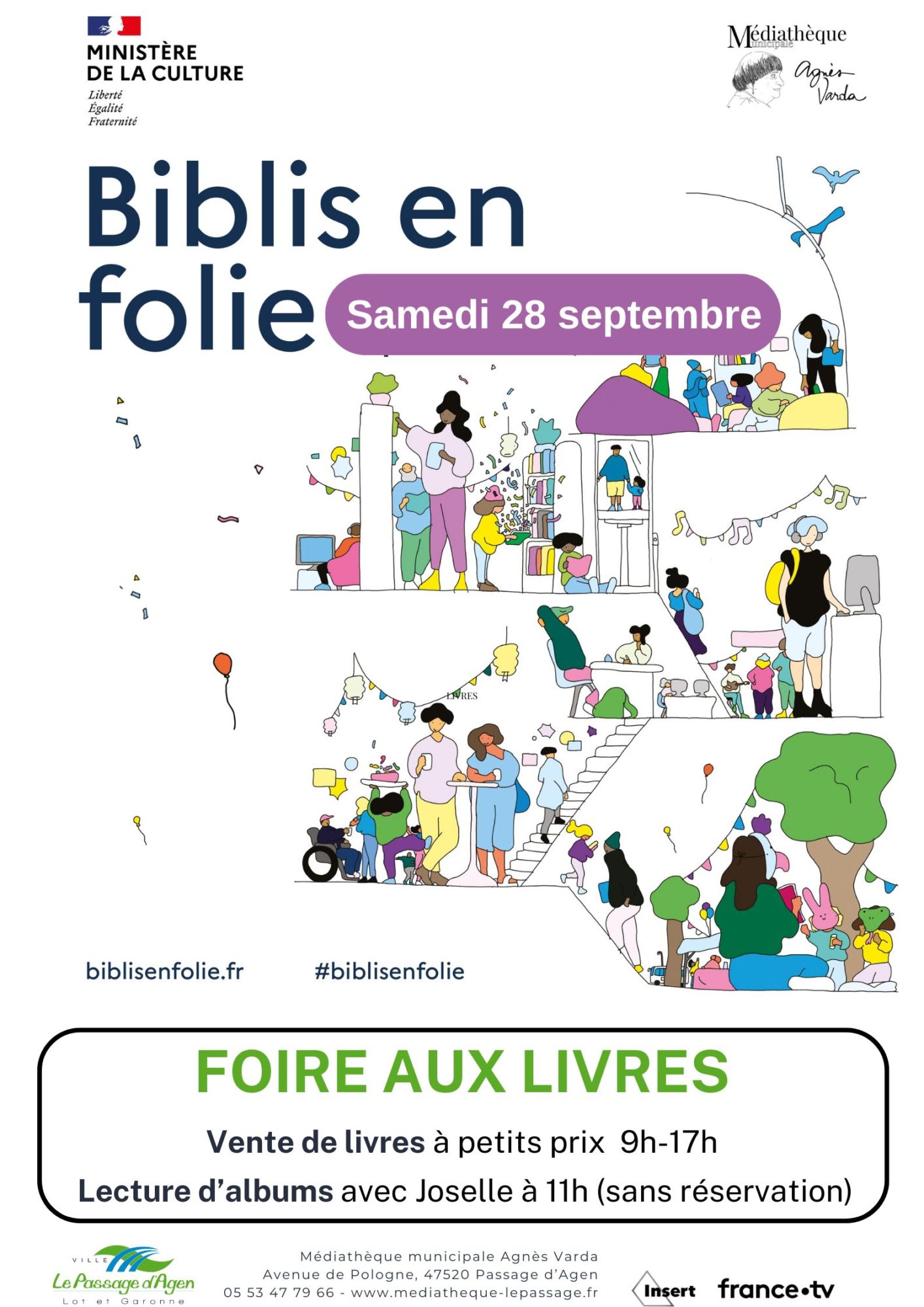 C’est donc à cette occasion et pour cette première édition de « Biblis en folie » que la médiathèque Agnès Varda du Passage organise une journée exceptionnelle d’ouverture le samedi 28 septembre avec une foire aux livres (vente de livres retirés des collections à petits prix) et la présence d’une conteuse bénévole « Joselle » de 11h à 12h (gratuit).