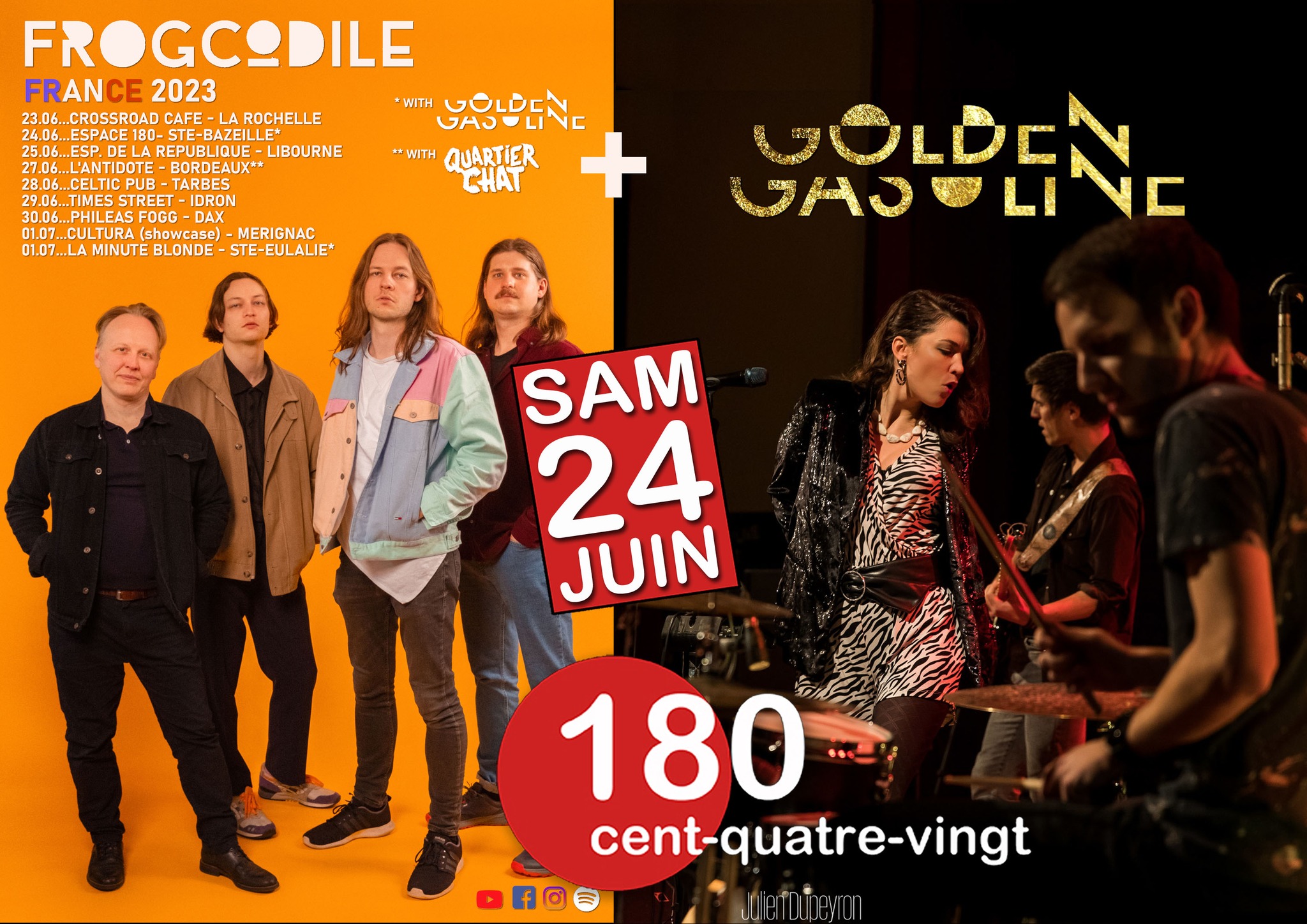 Venez découvrir le rock mélodique de FROGCODILE. Ils viennent de Wuppertal (Allemagne) et pour leur tournée française, ils partageront la scène du 180 avec les bordelais de GOLDEN GASOLINE, trio rock sous influence musicale des années 90.
