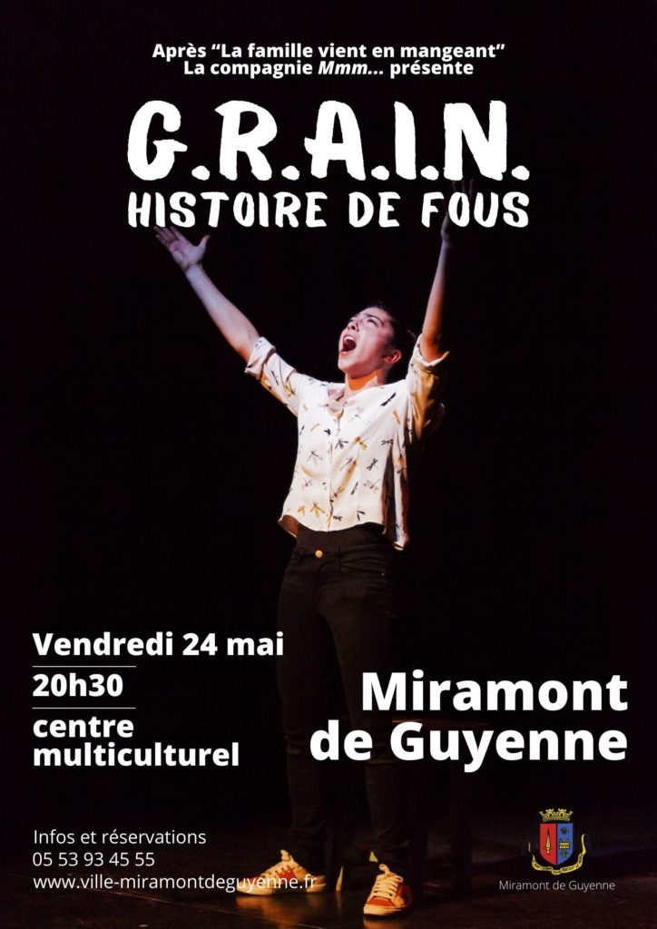 Après « la famille vient en mangeant » (1er volet qui a remporté un réel succès lors de la 29ème édition du Festival des Arts de la Rue 2023), la compagnie Mmm… revient à Miramont vendredi 24 mai à 20h30 au centre multiculturel de Miramont de Guyenne pour « G.R.A.I.N., histoire de fous ».