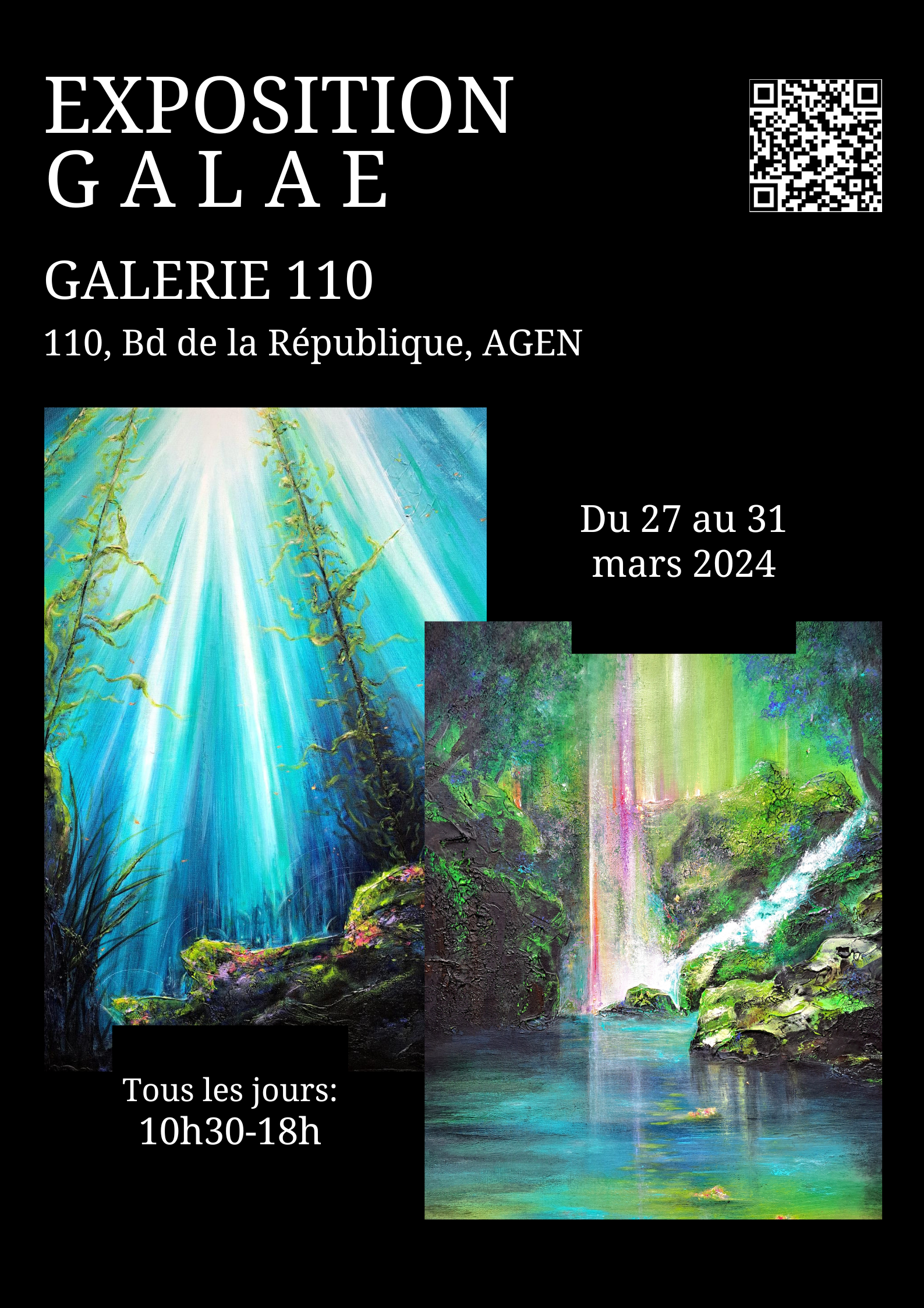 Artiste Peintre Agenaise, Galae vous invite à découvrir son univers onirique, où chacune de ses créations se laisse suggérer par une part de réel et d’irréel, de métaphysique et parfois même de fantastique.Les séries exposées s’intitulent « Eclat Terrestre » et « Aquantis » et transportent le regard du voyageur sur le contraste coloré de la beauté de ce monde, de sa surface jusque dans son intérieur .Chaque toile invite à la découverte et au voyage au cœur de l’être. Le but : Eveiller ou réveiller notre lumière intérieure, la faire vibrer sous nos yeux par une couleur, un symbole, une émotion et faire ainsi danser l’âme, au travers de l’art et de la vie.