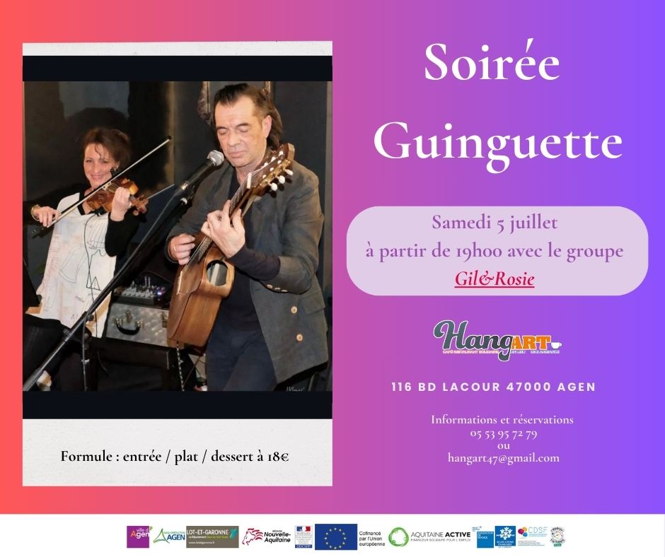 Concerts Gil&Rosie Repas-Concert Le Hang'art - Agen 116 Boulevard Edouard Lacour 47000 Agen Voir tous les événements se déroulant ici le 5 juillet A partir de 19h30 18€ Soirée guinguette avec le groupe Gil&Rosie. Stand'UP 06 95 77 25 56 animation@standup47.com