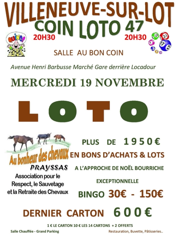 Grand loto en faveur de l’association Au Bonheur des Chevaux à Prayssas, tous les bénéfices vont à l’achat de nourriture pour nos animaux.