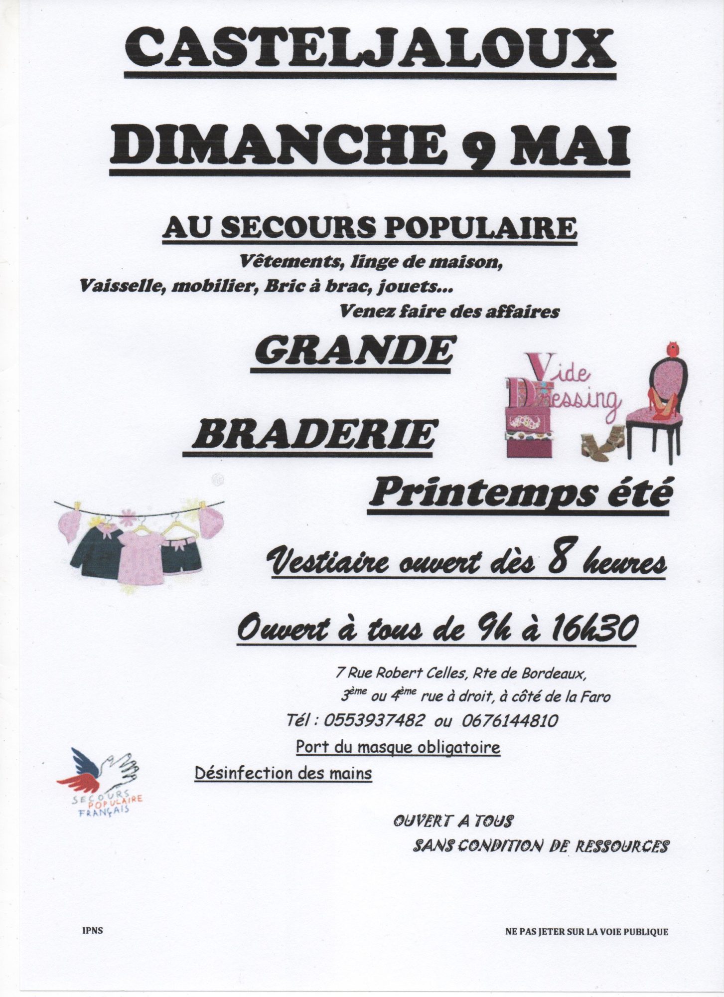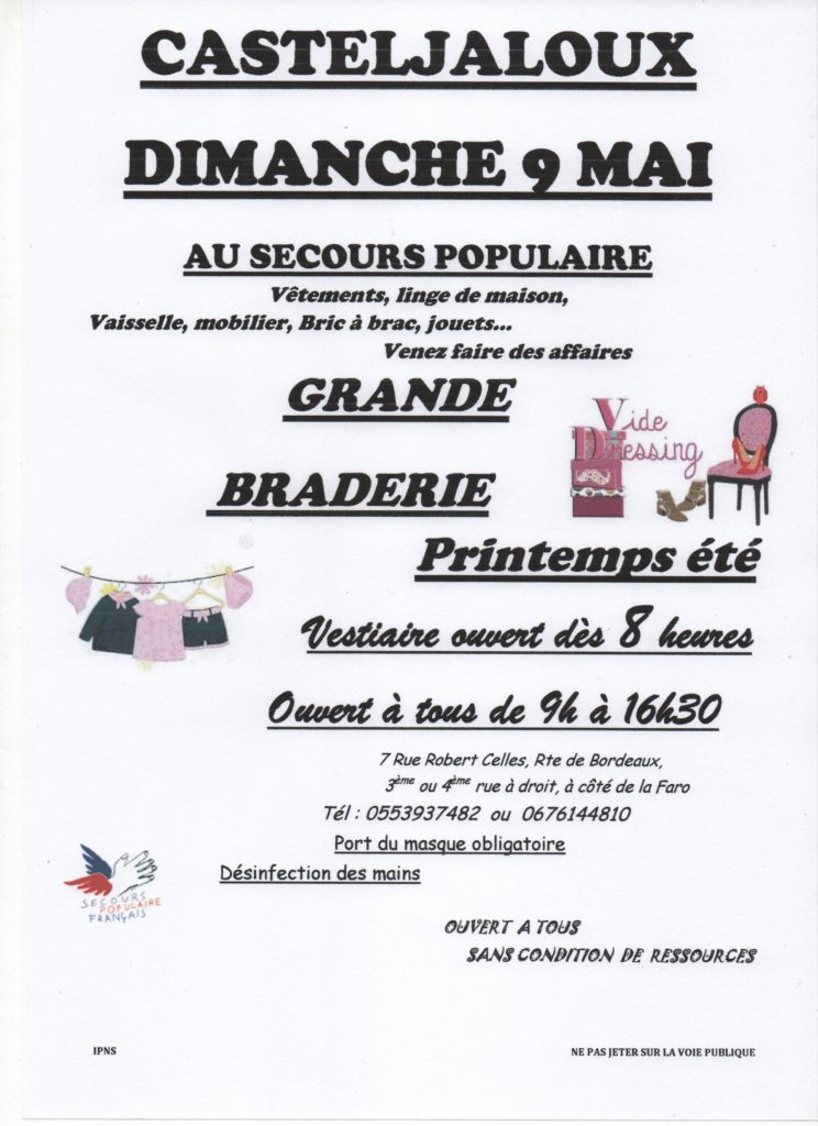 Loisirs Grande Braderie Printemps été Bonnes trouvailles Secours populaire Casteljaloux - Casteljaloux 7 Rue Robert Celles Casteljaloux Voir tous les événements se déroulant ici De 8h à 16h30 Gratuit Secours populaire Casteljaloux 05 53 93 98 80 - 06 76 14 48 10