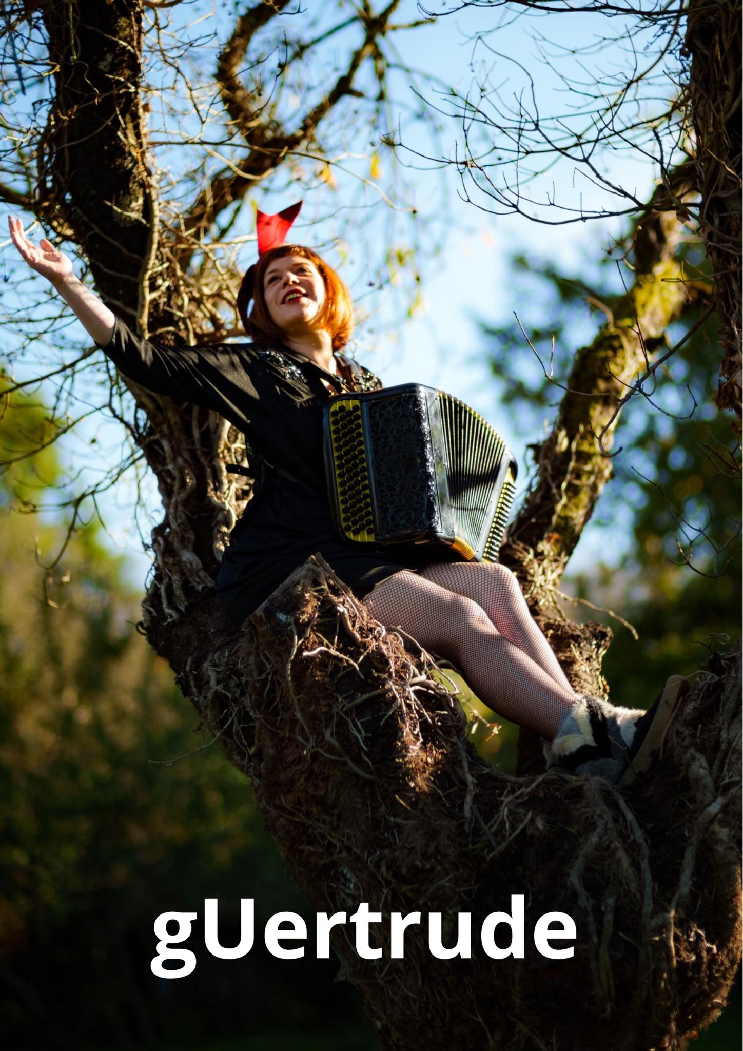 Guertrude c’est de la chanson réaliste brutale. Armée de son accordéon, Guertrude aborde des thèmes très féminins et engagés! De la mal bouffe au sexe il n’y a qu’un pas que Guertrude franchit tout en souplesse et de manière décomplexée !