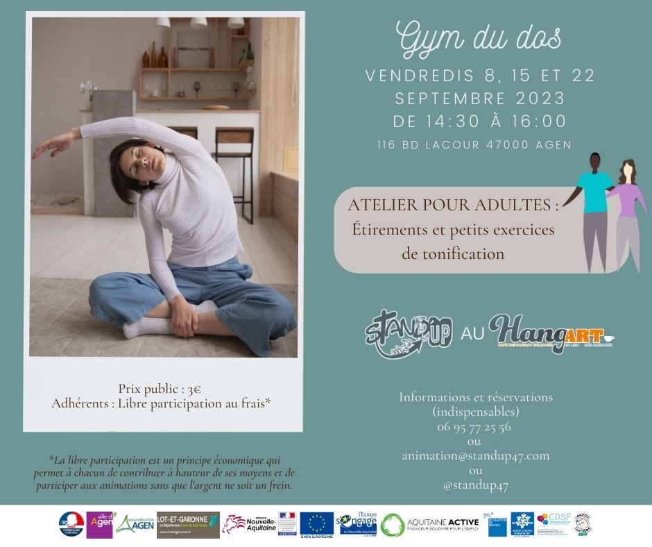 Loisirs Gym du dos Le Hang'art - Agen 116 Boulevard Edouard Lacour Agen Voir tous les événements se déroulant ici le 15 septembre 2023 De 14h30 à 16h 3€ Venez faire vos petits étirements quotidiens qui fait du bien. Stand'UP 06 95 77 25 56 animation@standup47.com