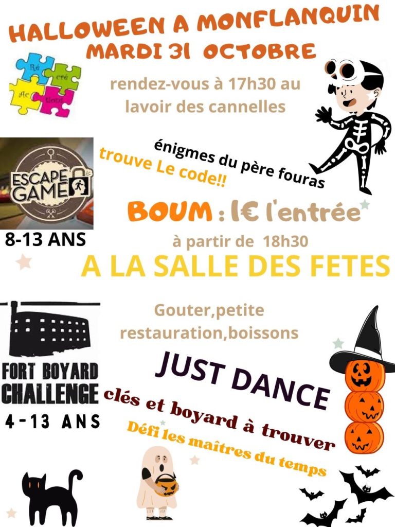 Un ESCAPE GAME à 17h30 au lavoir des Cannelles à Monflanquin, à faire en famille, et la BOUM DES HORREURS à partir de 18h30 : le traditionnel Just dance et un Fort Boyard challenge lors duquel petits et grand pourront se mesurer aux Maîtres du temps !