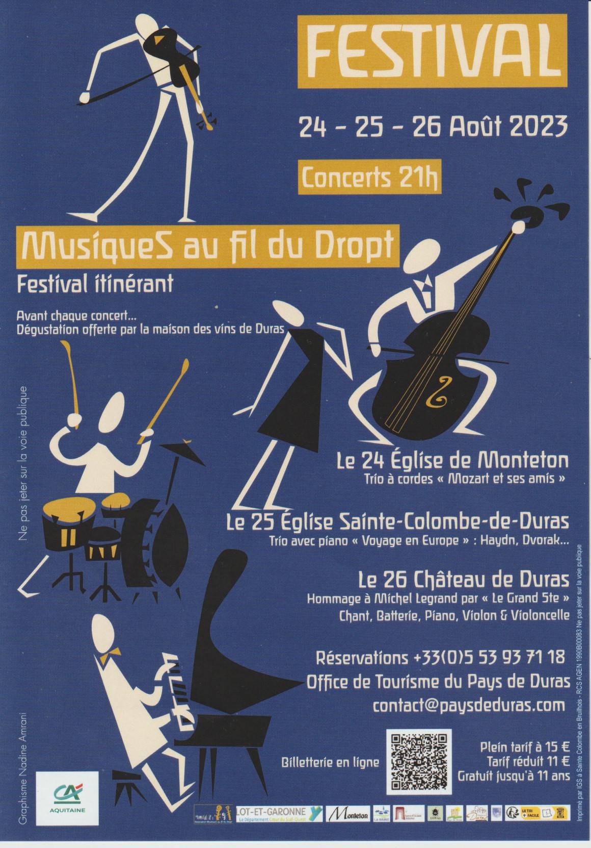 Ce festival passe par l’église de Monteton le 24 août Trio à cordes « Mozart et ses amis », l’église de Sainte Colombe de Duras le25 août Trio avec piano « Voyage en Europe » Haydn, Dvorak, … et se clôture au Château de Duras le samedi 26 août par une soirée jazz avec un hommage aux musiques de Michel Legrand en compagnie du « Le Grand 5tet »Chant, Batterie, Piano, Violon & Violoncelle.