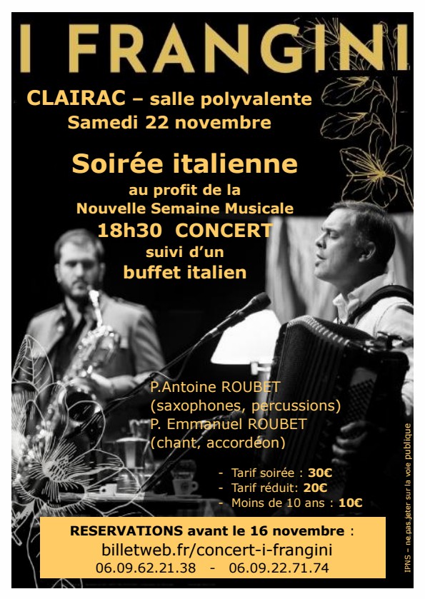 Concert de musique italienne donné par Antoine Roubet (saxophone et percussions) et Emmanuel Roubet (chant et accordéon).