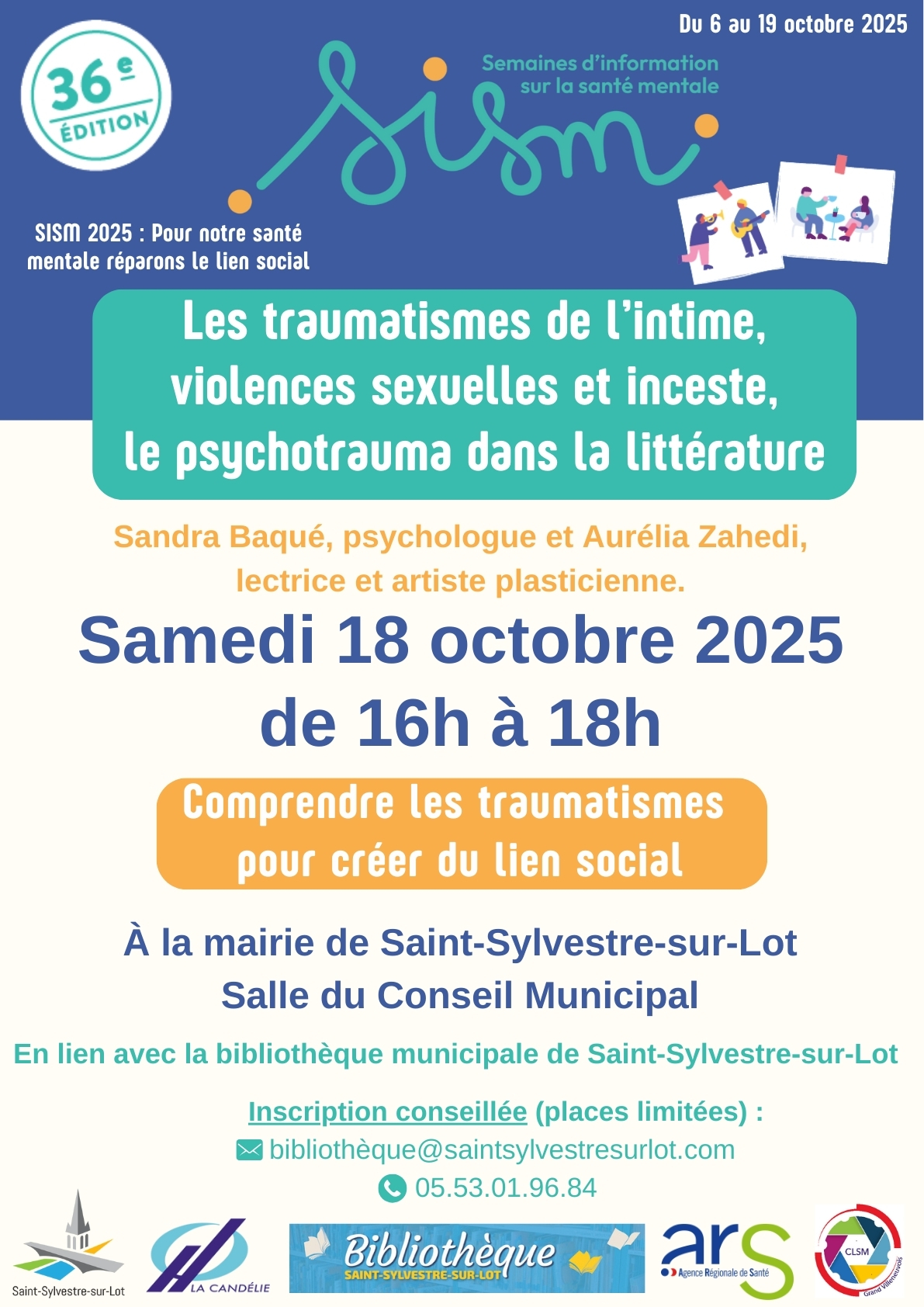La bibliothèque de Saint-Sylvestre-sur-Lot vous invite le samedi 18 octobre à 16h, à la mairie (salle du Conseil Municipal), pour assister à l’intervention de Sandra Baqué, psychologue et d’Aurélia Zahedi, lectrice plasticienne.