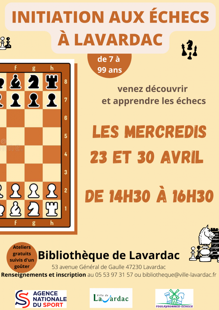 Les passionnés d’échecs, débutants ou confirmés, sont invités à participer aux ateliers d’échecs gratuits organisés par la Bibliothèque de Lavardac ! Deux sessions auront lieu les mercredis 23 et 30 avril de 14h30 à 16h30.