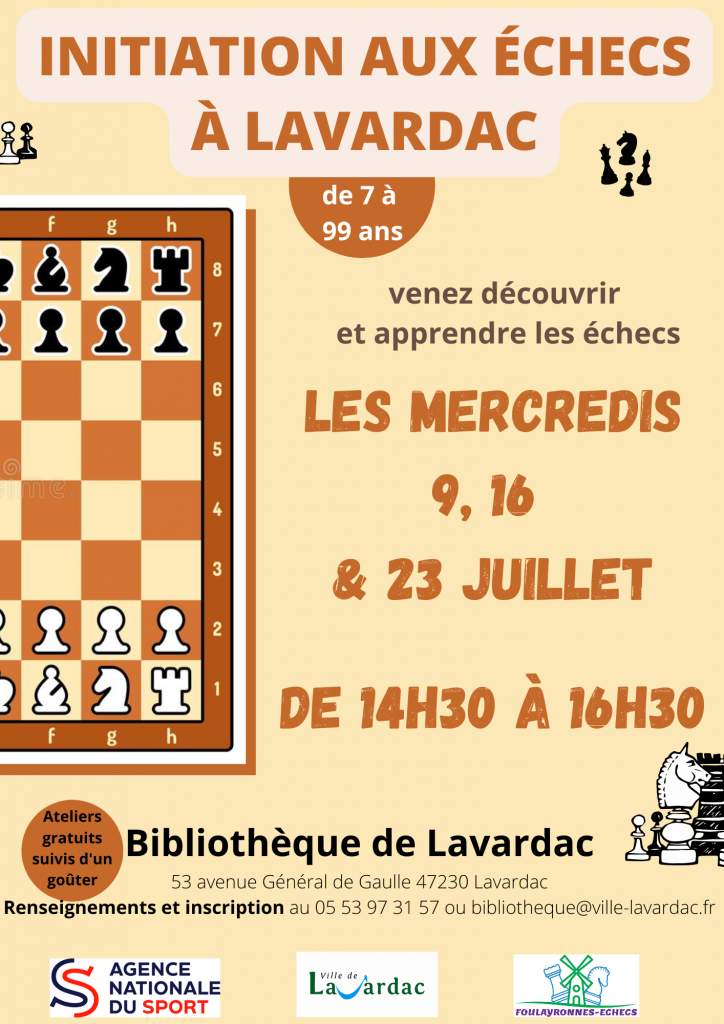 Ne manquez pas cette occasion de découvrir ou de perfectionner votre jeu d’échecs dans une ambiance conviviale et stimulante ! Pour toute inscription ou renseignement, contactez la bibliothèque de Lavardac par téléphone ou par mail.