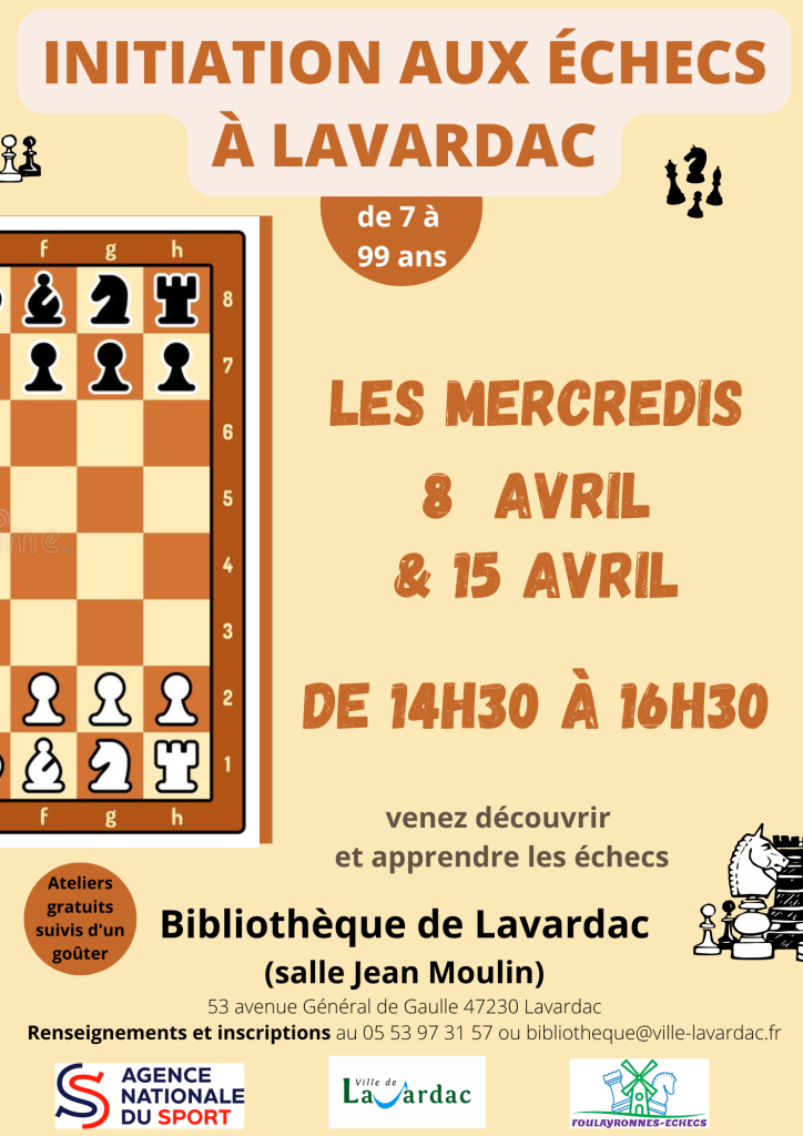 Ne manquez pas cette occasion de découvrir ou de perfectionner votre jeu d’échecs dans une ambiance conviviale et stimulante ! Pour toute inscription ou renseignement, contactez la bibliothèque de Lavardac par téléphone ou par mail.