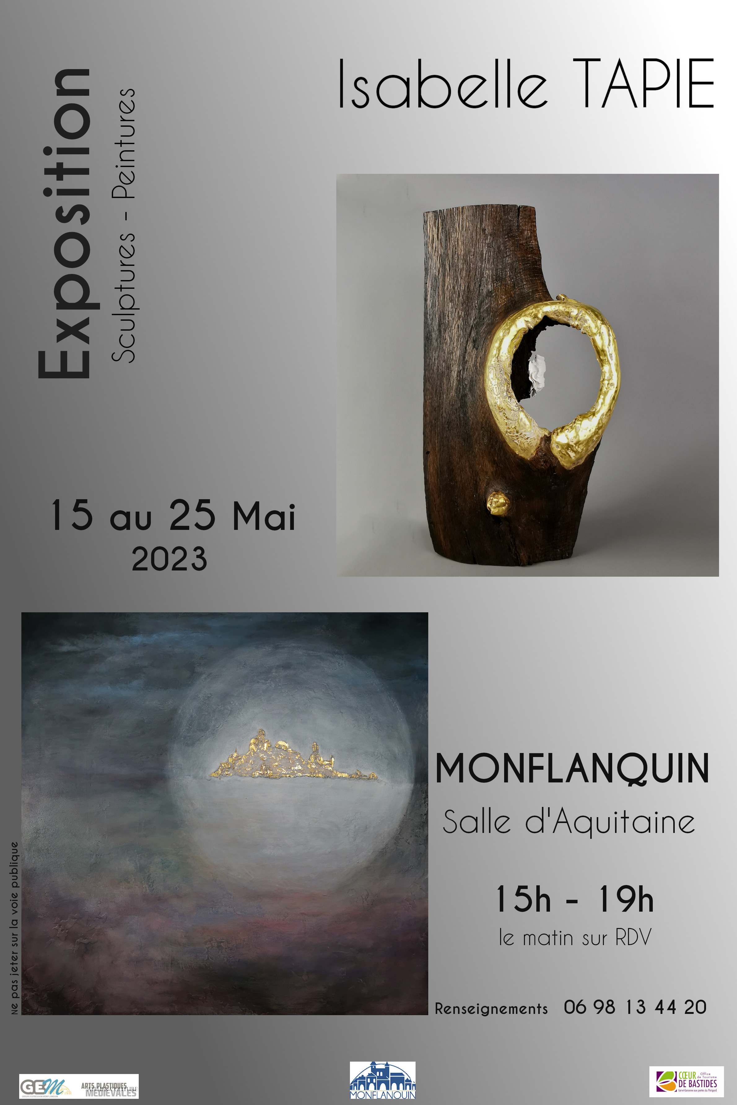 Les sculptures: Les feuilles d’or, parfois quelque pierre fine brute, s’invitent au creux le plus intime de branches, écorces, troncs d’arbres, bois bruts naturels, noircis à la flamme ou blanchis, pour raconter, révéler quelques secrets, inviter au rêve.