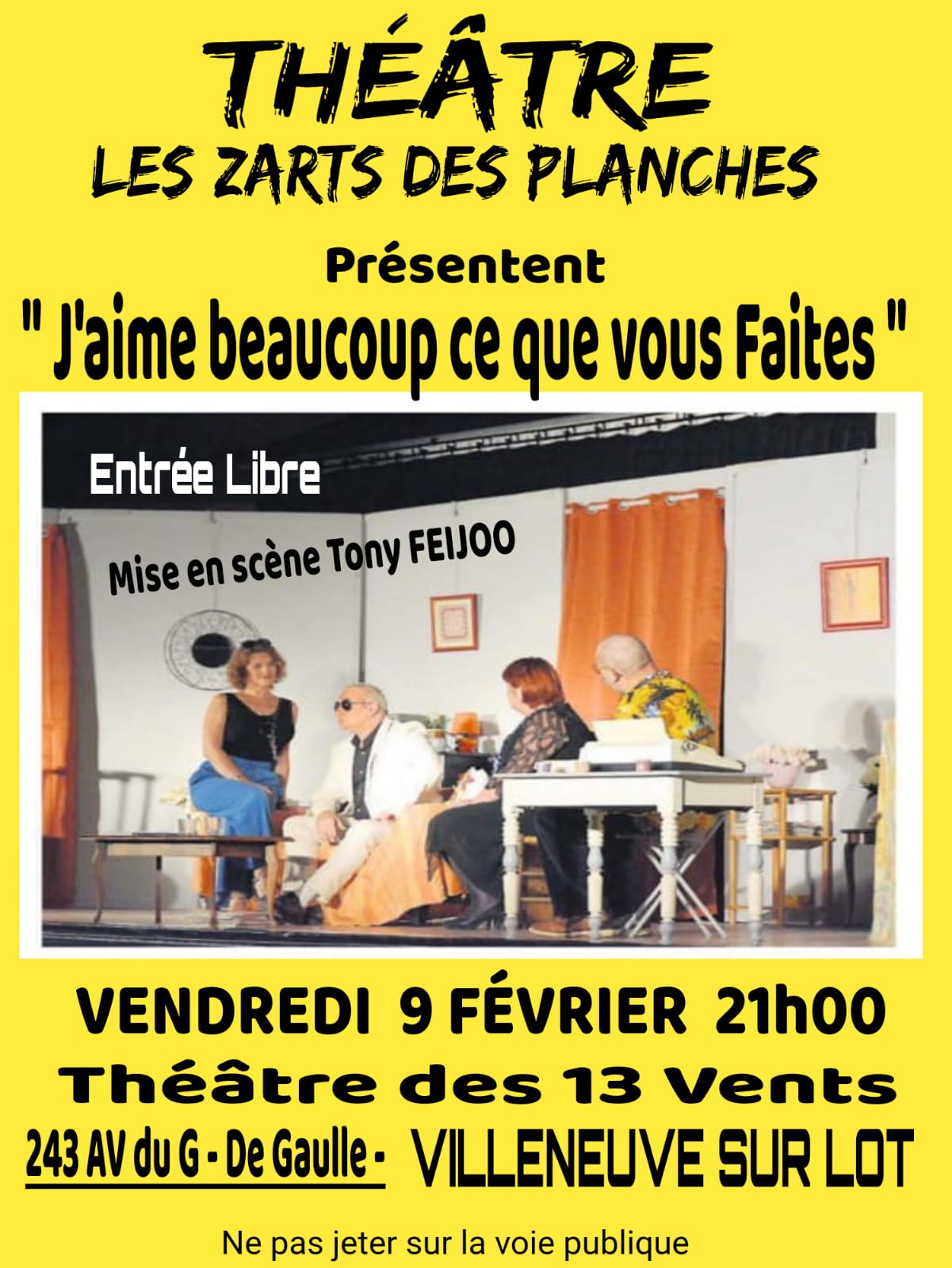 La troupe de théâtre Les Z’Arts des Planches vous présente une pièce de Carole Greep, mise en scène par Tony Feijoo.Comment une fausse manœuvre avec un téléphone portable vous fait découvrir ce que vos meilleurs amis pensent de vous en réalité, juste avant leur arrivée pour un week-end finalement pas comme les autres dans votre maison de campagne…