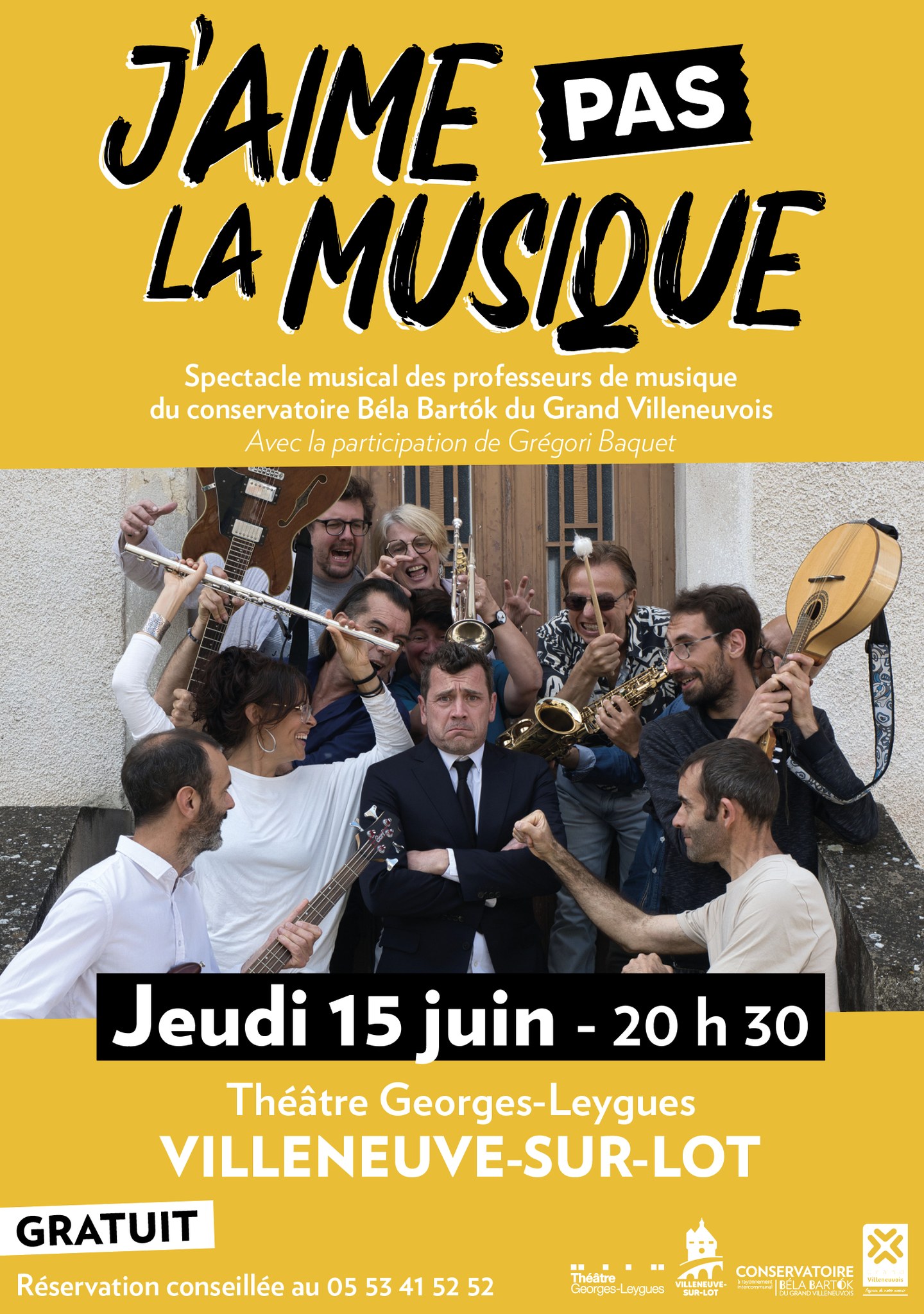 Jeudi 15 juin à 20h30, au théâtre Georges-Leygues, le Conservatoire à rayonnement intercommunal Béla Bartók du Grand Villeneuvois vous convie au spectacle musical « J’aime pas la musique ».