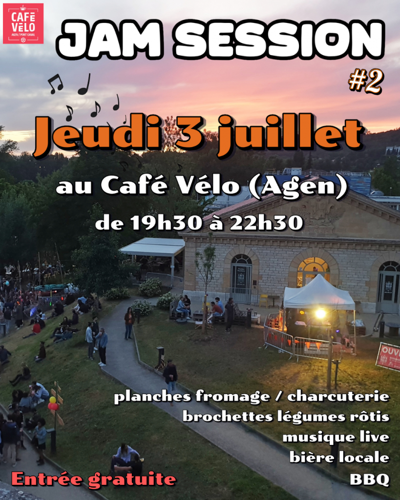 Le Café Vélo à Agen, lieu atypique au pied du Pont-Canal mêlant bar, restauration, location & réparation de vélo, lance une nouvelle proposition musicale cet été : une jam session en plein air, dans une ambiance festive et décontractée.