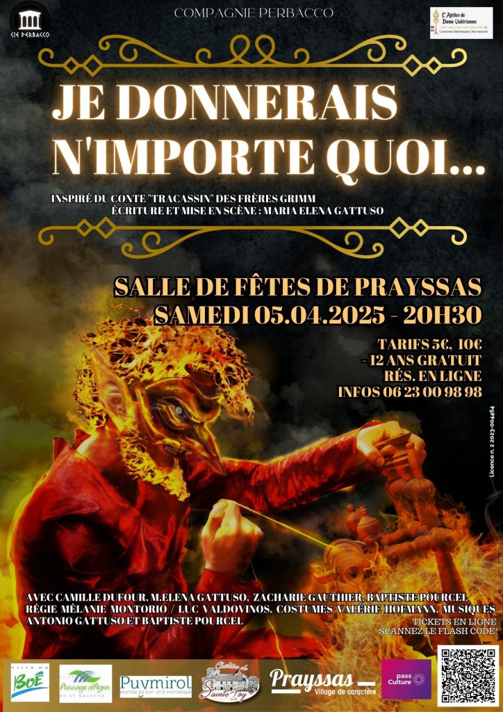La compagnie PerBacco vous donne rendez-vous le samedi 5 avril à 20h30 à la salle des fêtes de Prayssas pour le spectacle tout public : « Je donnerais n’importe quoi… » inspiré du conte « Tracassin » (Rumpelstilzchen) des Frères Grimm.