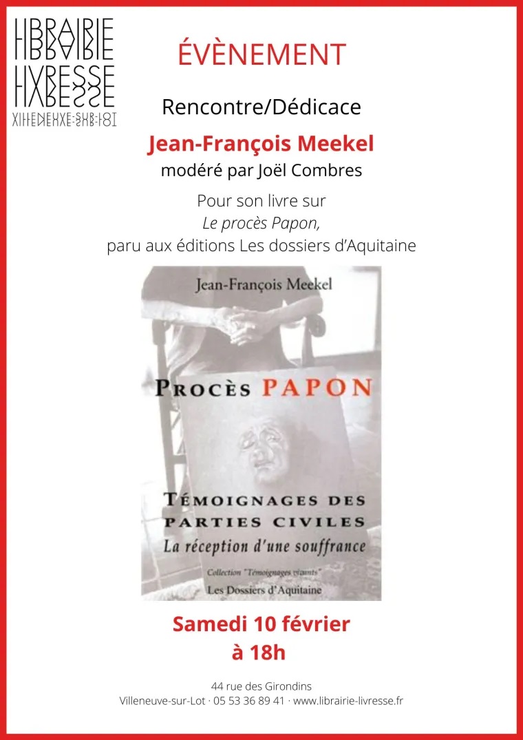 Samedi 10 février à 18h, Jean-Francois Meekel viendra nous parler de son livre « Procès Papon », paru aux éditions Les dossiers d’Aquitaine.