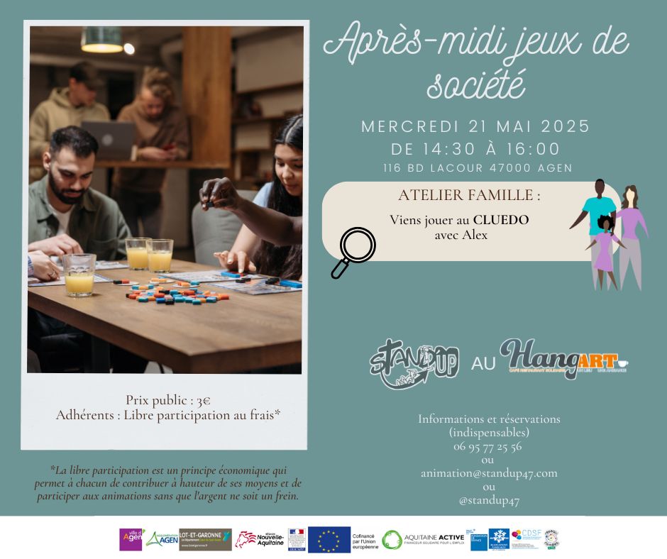 Loisirs Jeu de société Le Hang'art - Agen 116 Boulevard Edouard Lacour 47000 Agen Voir tous les événements se déroulant ici le 21 mai De 14h30 à 16h Familial 3€ Venez jouer au Cluedo avec Alex. Stand'UP 06 95 77 25 56 animation@standup47.com