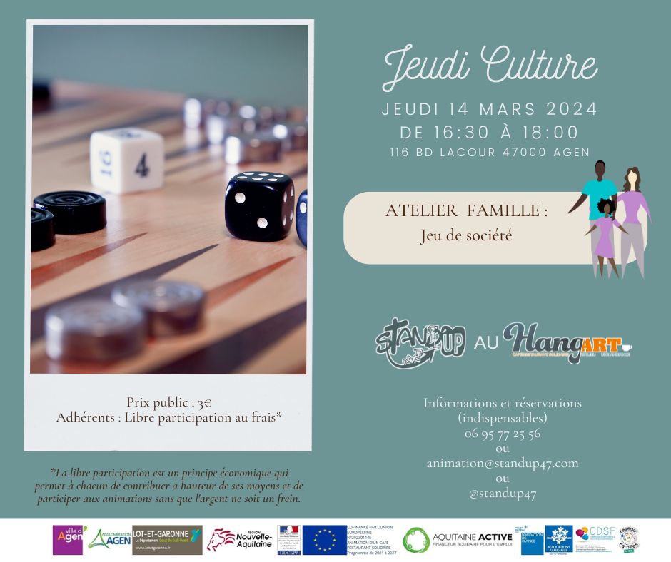 Loisirs Jeudi Culture Le Hang'art - Agen 116 Boulevard Edouard Lacour Agen Voir tous les événements se déroulant ici le 14 mars 2024 De 16h30 à 18h Familial 3€ Après-midi jeux de société en famille. Stand'UP 06 95 77 25 56 animation@standup47.com