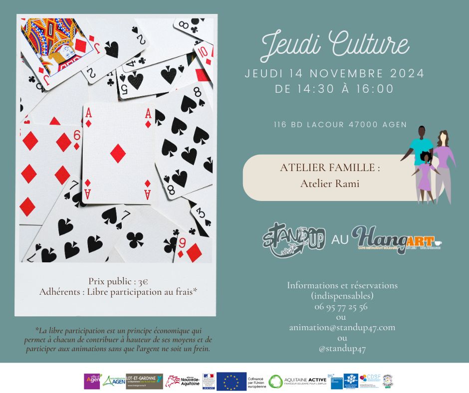 Loisirs Jeudi Culture Le Hang'art - Agen 116 Boulevard Edouard Lacour 47000 Agen Voir tous les événements se déroulant ici le 14 novembre 2024 De 14h30 à 16h 3€ Vous aimez jouer au Rami, venez au Hang’ART. Stand'UP 06 95 77 25 56 animation@standup47.com
