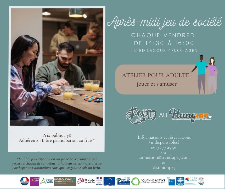 Loisirs Jeux de société Le Hang'art - Agen 116 Boulevard Edouard Lacour Agen Voir tous les événements se déroulant ici le 12 mai 2023 De 14h30 à 16h 3€ Venez nombreux pour vous amusez ! Stand'UP 06 95 77 25 56 animation@standup47.com
