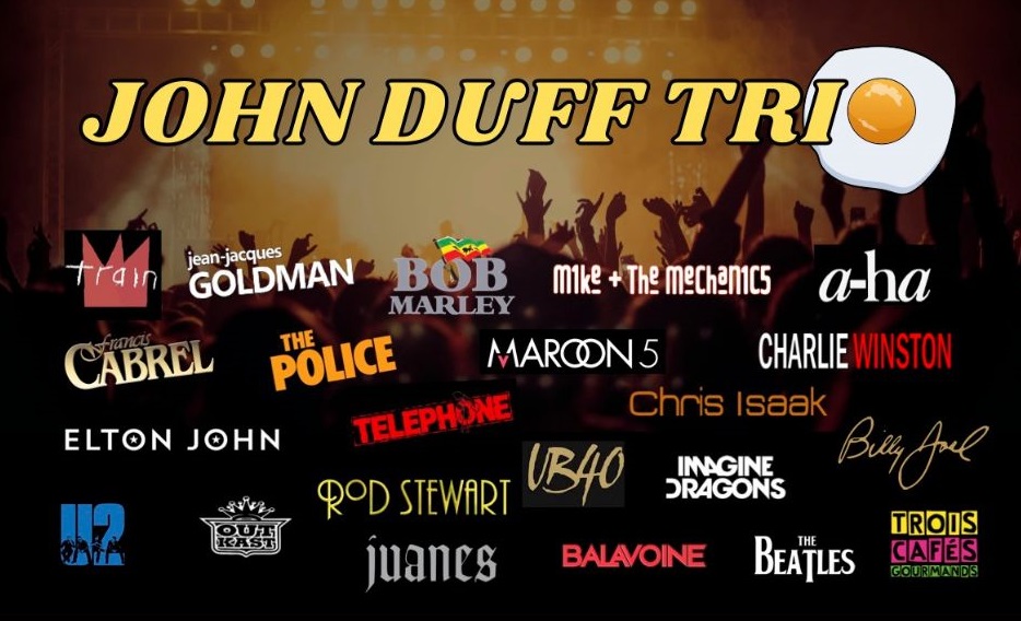 Éclectique, électrique, acoustique, John Duff Trio vous transporte au son de Francis Cabrel, Daniel Balavoine, U2, Juanes, Robbie Williams, Imagine Dragons, Coldplay, Train, Fine Young Cannibals, Stevie Wonder, Mike & The Mechanics, Gérald De Palmas, The Police et bien d’autres encore!