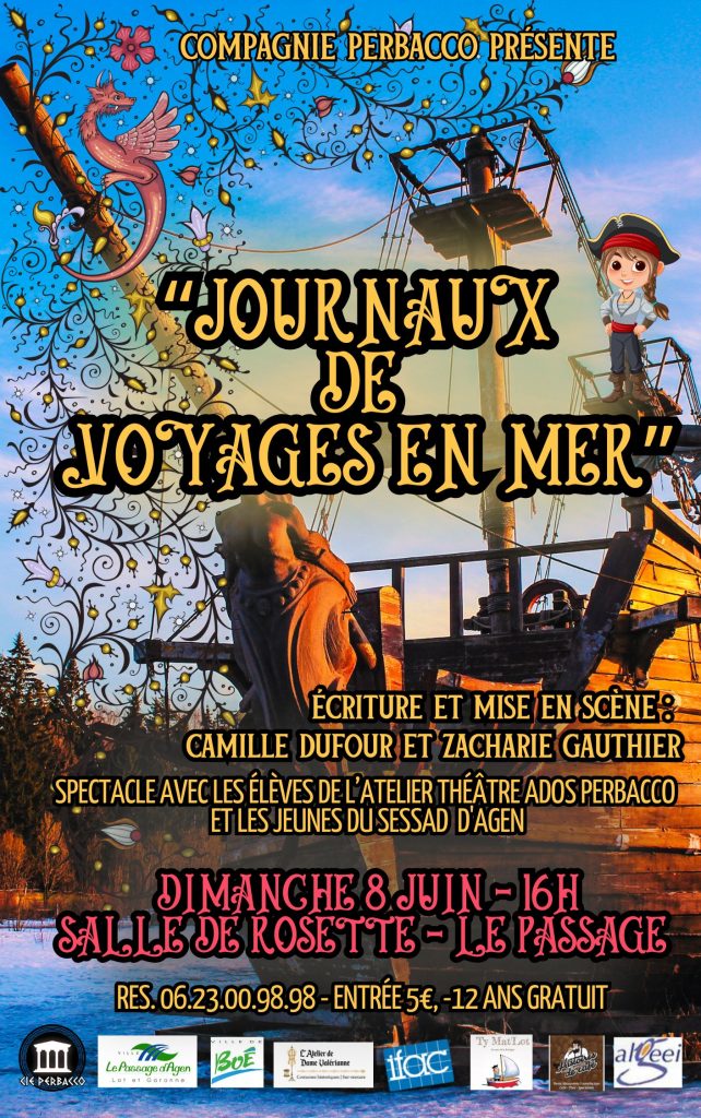 Venez embarquer le dimanche 8 juin à 16h à la salle des fêtes de Rosette au Passage pour le spectacle de l’Atelier théâtre ados PerBacco, avec les jeunes du SESSAD d’Agen : « Journaux de voyage en mer », une comédie d’aventure écrite et mise en scène par Camille Dufour et Zacharie Gauthier.