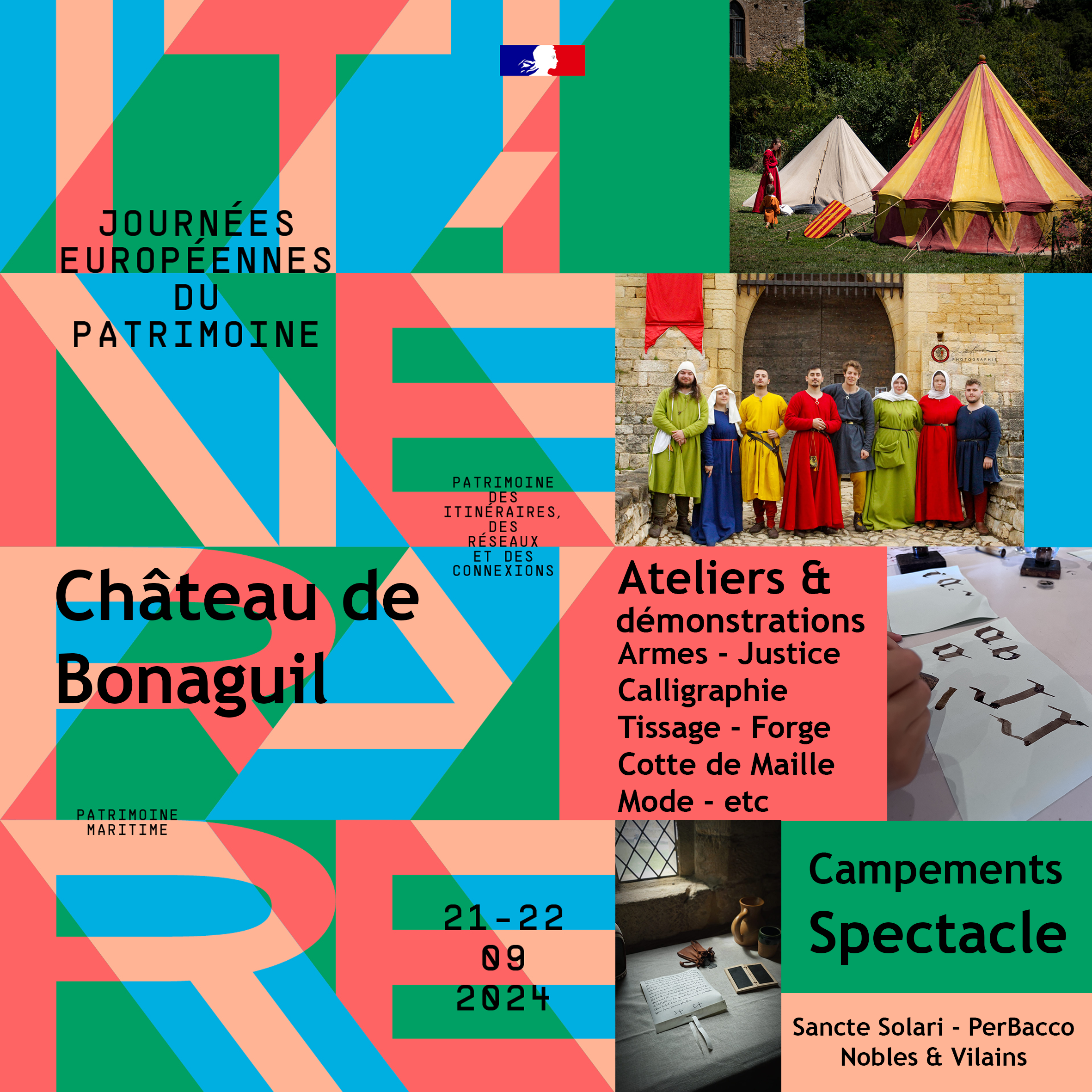 Les 21 et 22 Septembre, à l’occasion des Journées européennes du patrimoine, le château de Bonaguil accueille deux troupes de reconstitution historique (Sancte Solari et Nobles & Vilains) et proposera des animations tout le week-end. Hygiène, mode, armement, calligraphie, forge, tissage, etc.