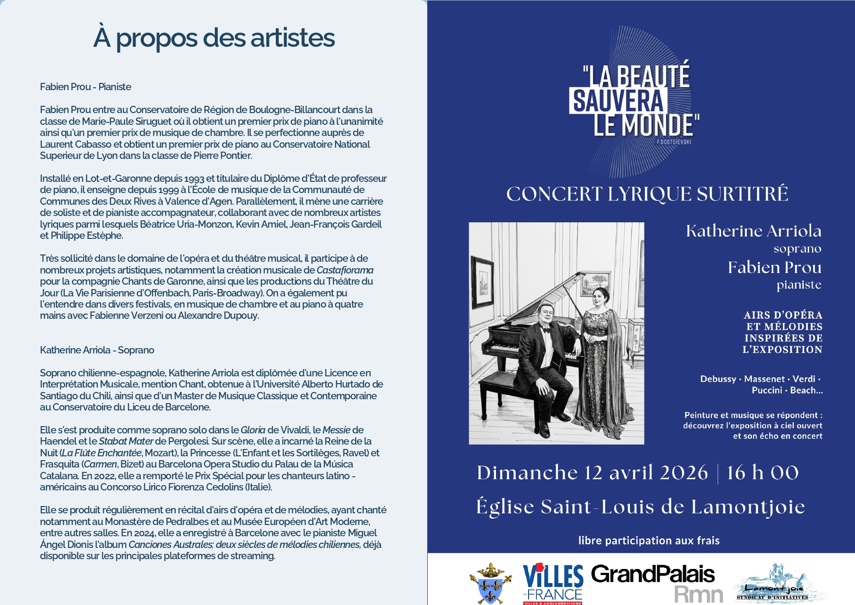 Sur scène, la soprano Katherine Arriola (de Saint-Vincent-de-Lamontjoie) et le pianiste Fabien Prou interpréteront des airs de Verdi, Puccini, Debussy, Massenet et Beach. Chaque morceau a été choisi pour faire écho aux tableaux exposés dans le village.
