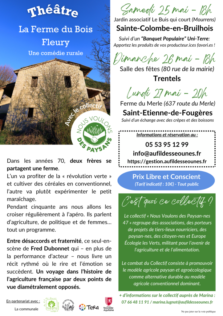 Proposé par l’association Au Fil des Séounes et le Collectif Nous voulons des paysans 47.Dans les années 70, deux frères se partagent une ferme. L’un va profiter de la « révolution verte » et cultiver des céréales en conventionnel, l’autre va plutôt expérimenter le petit maraîchage. Pendant cinquante ans nous allons les croiser régulièrement à l’apéro. Ils parlent d’agriculture, de politique et de femmes… tout un programme.Entre désaccords et fraternité, ce seul en scène qui en plus de la performance d’acteur nous livre un récit rythmé, où le rire et l’émotion se succèdent. Un voyage dans l’histoire de l’agriculture française par deux points de vue diamétralement opposés.Spectacle tout public.