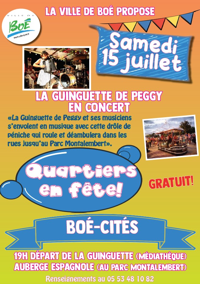 Quartiers en fête 2023 pose ses valises à Boé-Cités le samedi 15 juillet à partir de 19h sur le parking de la Médiathèque Camille Ripoll.