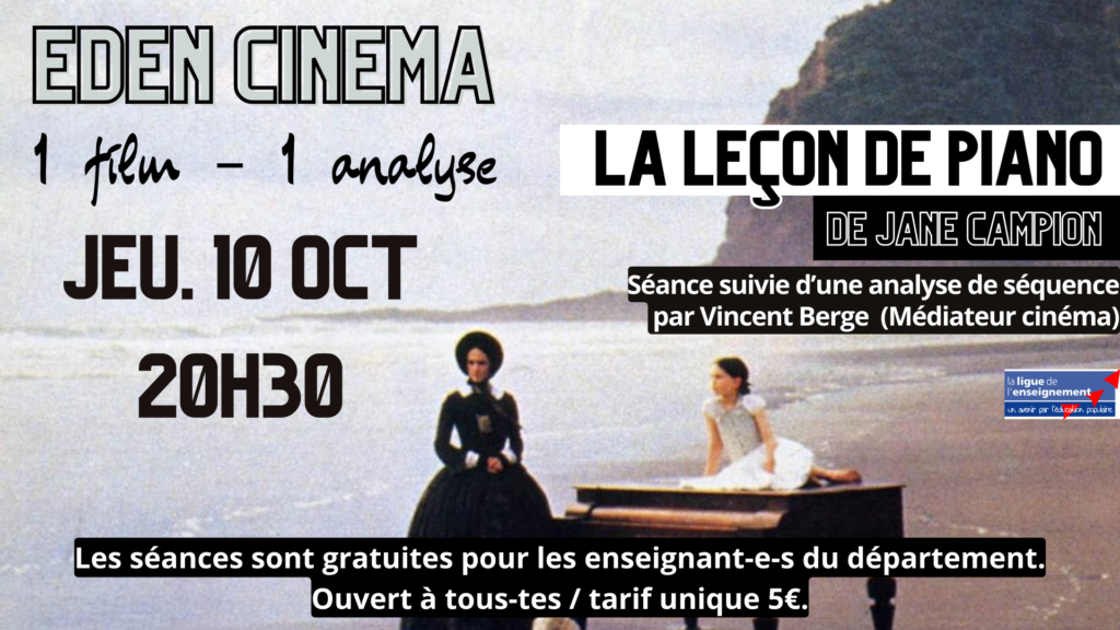 20h30 : Projection du film La leçon de piano de Jane Campion, puis analyse de séquence (20 min) par Vincent Berge, médiateur cinéma de La Ligue de l’Enseignement.