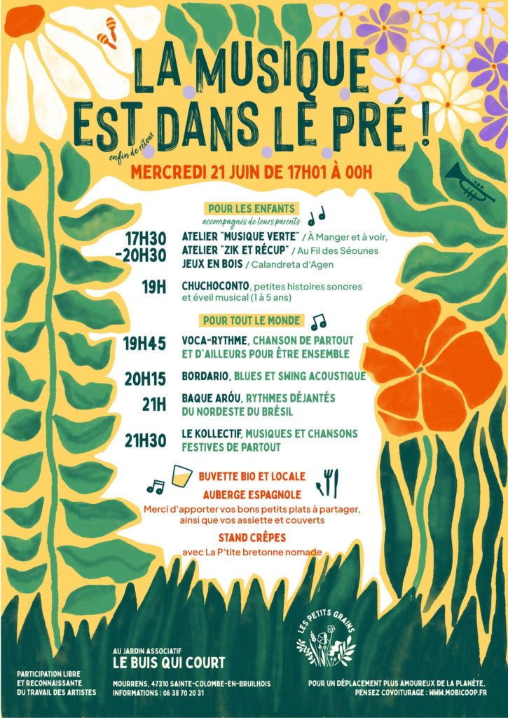 Pour les enfants (accompagnés de leurs parents) :– 17h30-20h30 : A Manger et à voir, atelier « Musique verte » / Au Fil des Séounes, atelier « Zik et récup » / Calandreta d’Agen, jeux en bois