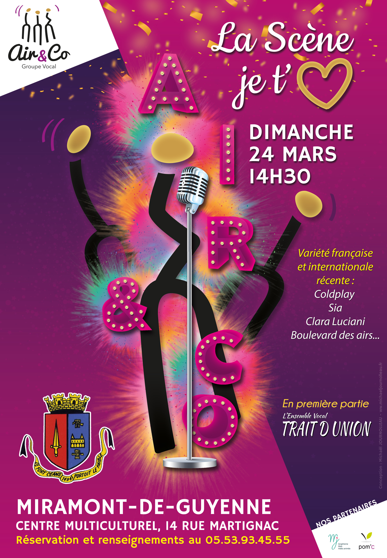 Air & Co le groupe vocal fondé en 2016 par une ancienne Miramontaise, se produira à Miramont le dimanche 24 mars 2024.Ce groupe composé d’une quinzaine de choristes amateurs, situé sur le Haillan à côté de Bordeaux, est apprécié pour sa passion pour la musique et sa diversité musicale.Coachés par 3 professionnels du chant, ils chantent et dansent sur de la variété française et internationale récente, harmonisée à 3 voix par les coachs.Leur dernier spectacle en janvier 2023 a été donné à guichet fermé sur le Haillan, une salle de 450 places. Certains miramontais avaient fait le déplacement et ont émis le souhait de faire partager une parenthèse musicale à Miramont.En préparation du prochain spectacle, le groupe s’arrêtera sur Miramont pour vous présenter un extrait de « la scène je t’aime ». Au programme : des reprises de Boulevard des airs, Clara Luciani, Christine and the Queen, Indochine, Sia…Le 24 mars, à Miramont de Guyenne, sera l’occasion idéale de découvrir leur répertoire musical varié et leurs harmonies vocales !