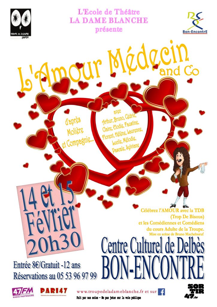 Les élèves du cours adultes du mercredi de la TDB (Troupe de la Dame Blanche) revisitent le classique de Molière « L’Amour Médecin », piochent dans des extraits du « Médecin malgré lui », empruntent une pièce en un acte de Courteline et rajoutent à cela, beaucoup de fantaisie… De l’amour, de l’humour, des chansons et en plus, ils et elles seront 13 sur scène !