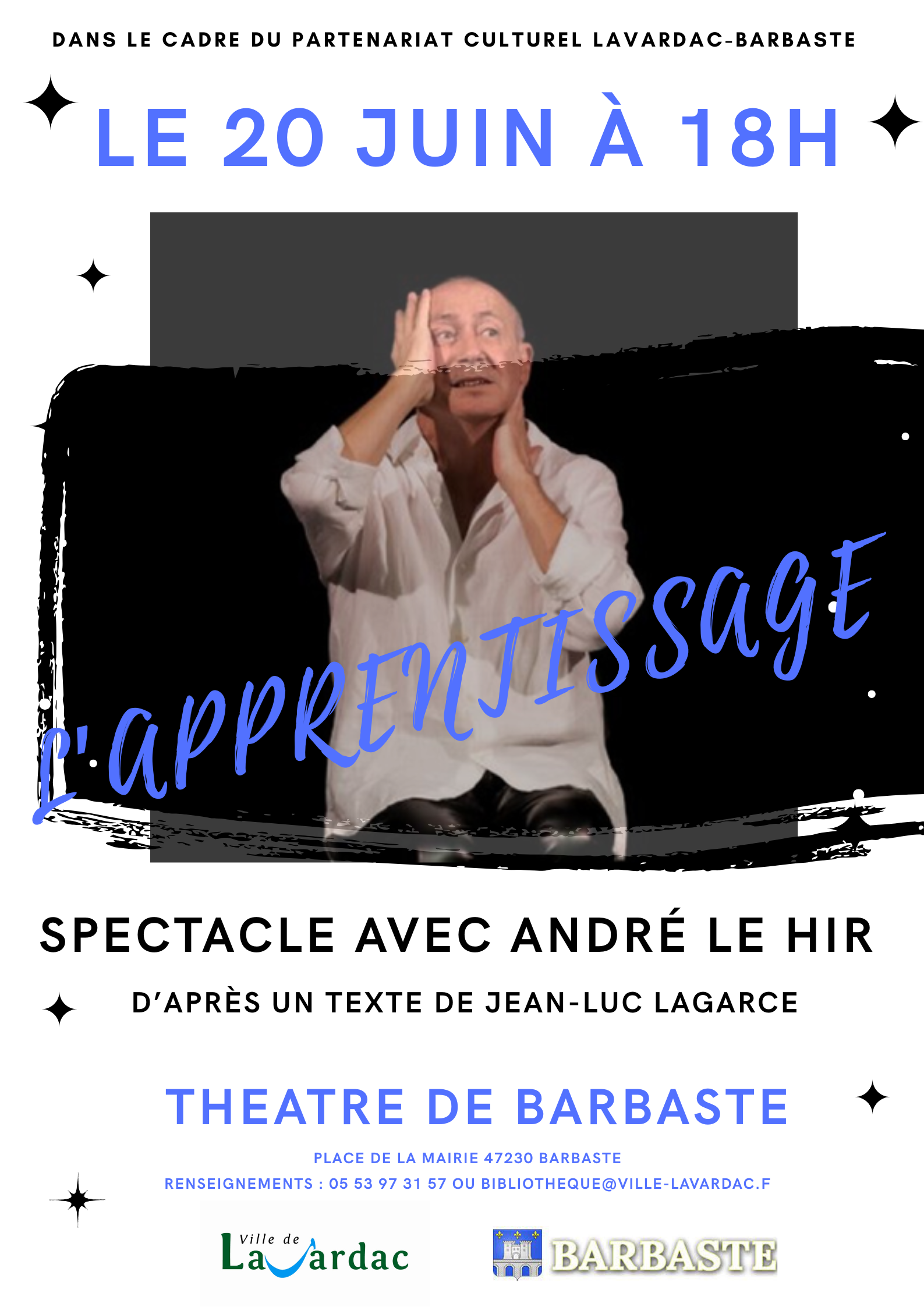 Dans le cadre du partenariat culturel entre les villes de Lavardac et Barbaste, le vendredi 20 juin à 18h au Théâtre de Barbaste  : L’Apprentissage.