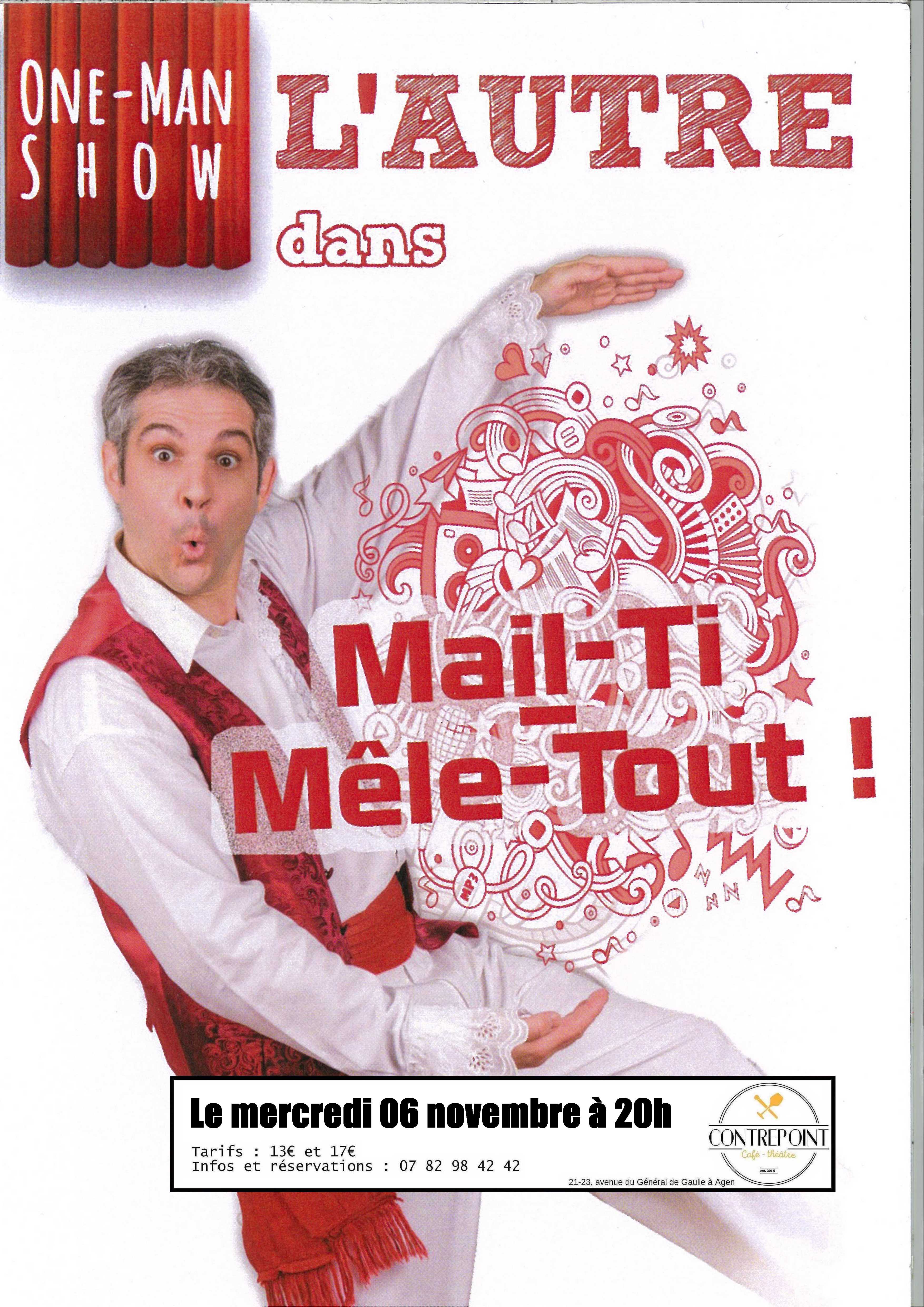 Il présente au public, qu’il fait participer, un spectacle transgénérationnel. Entre jeux de mots, textes loufoques, et chansons humoristiques, un divertissement délirant « servi sur plateau » 100%… Mail-ti mêle-tout !