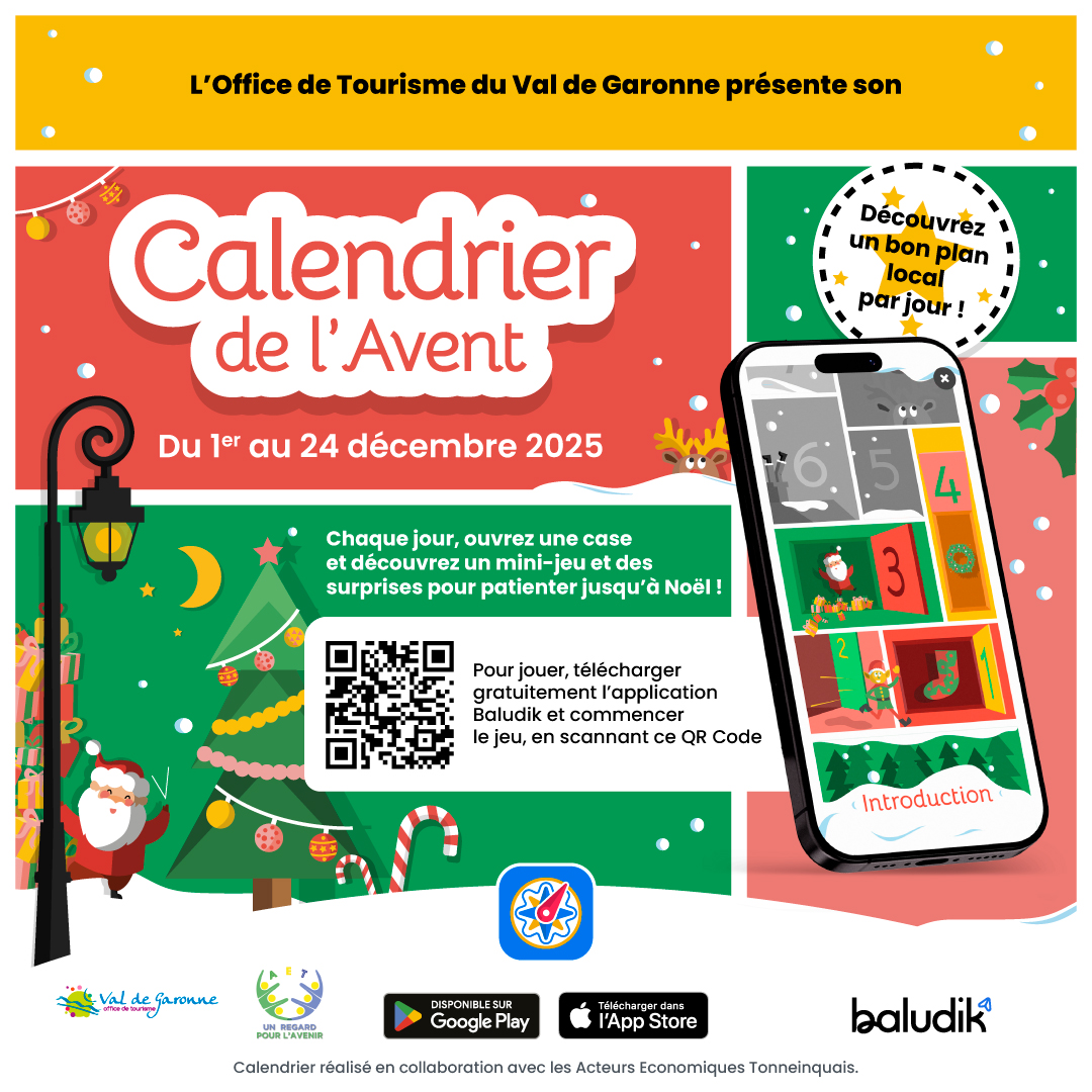 L’Office de Tourisme du Val de Garonne et ses partenaires, dont les Acteurs Économiques du Tonneinquais ont préparé une GRANDE NOUVEAUTÉ pour patienter jusqu’au 25 décembre : un Calendrier de l’Avent 100% local et digital !