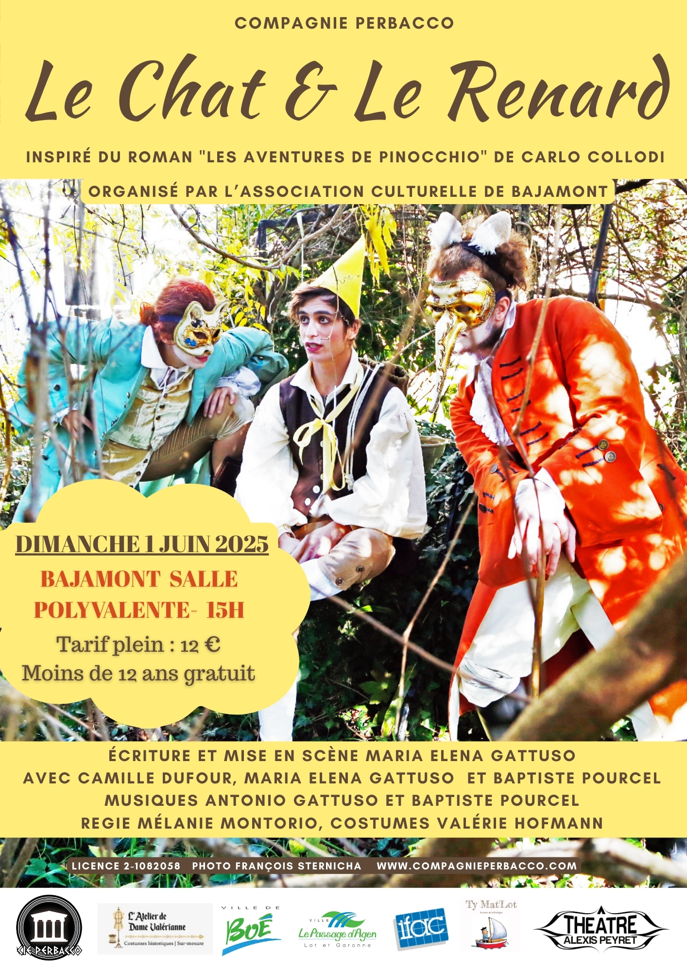 Rendez-vous le dimanche 1 juin 2025 à la salle polyvalente de Bajamont pour le spectacle « La Chat & le Renard », un spectacle tout public inspiré du roman « Les aventures de Pinocchio » de de Carlo Collodi.